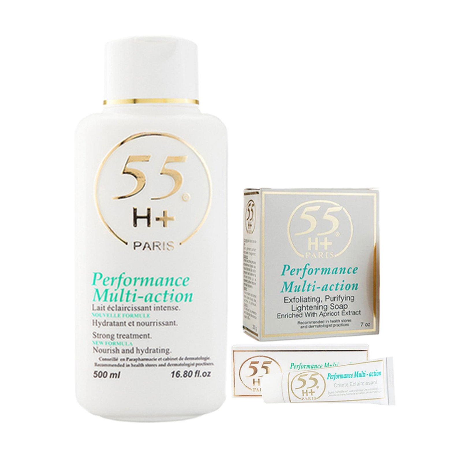 (Duplicate/Variant) 55H+ Multi-Action Lightening Pack of 3 – Brighten & Even Skin provides a curated selection for effective brightening. It typically contains the core items: Soap, Lotion, and Serum or Cream. It is designed to work in harmony to fade hyperpigmentation and reveal a uniform skin tone. The multi-action formula addresses dryness and dullness while whitening.