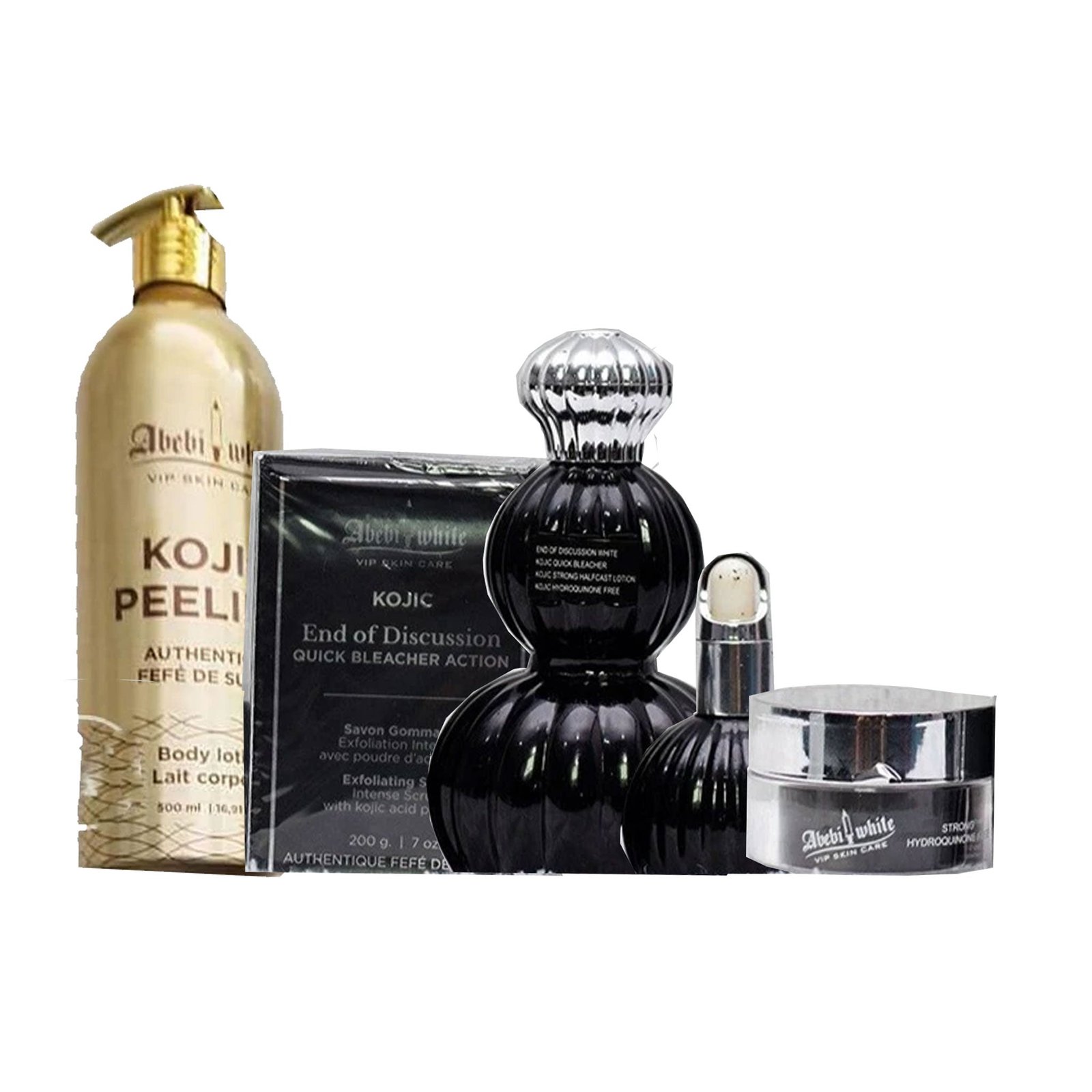 Abebi White End of discussion KOJIC QUICK BLEACHING ACTION Pack of 5 is a comprehensive regimen. It includes five items (likely Soap, Lotion, Serum, Face Cream, Oil) for full-body whitening. It harnesses Kojic Acid for potent bleaching action. It ensures every step of the routine contributes to lightening. It offers maximum value and efficacy. To use, follow the complete daily routine.