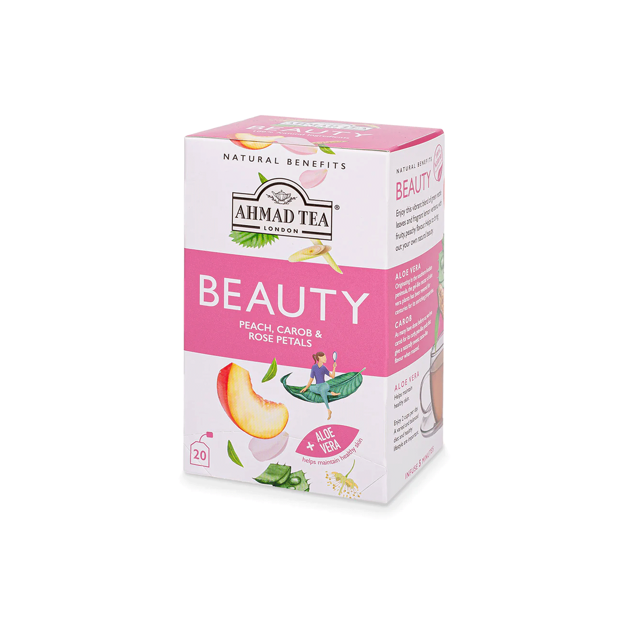 + Delivery in 24 Hours!Ahmad Tea Beauty is the caffeine-free herbal tea blend with Aloe Vera, Peach, and Rose petals designed to support skin health and hydration.
