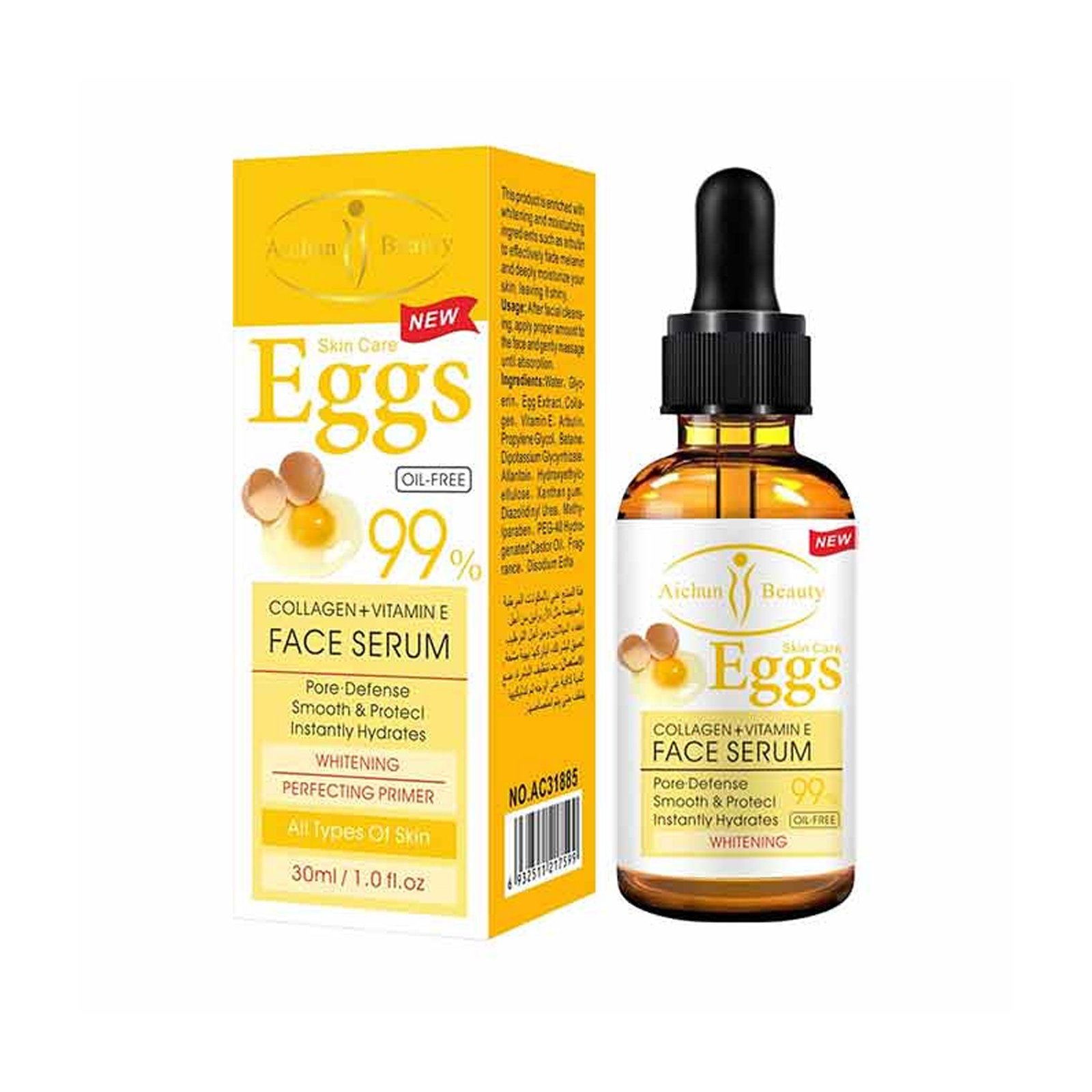 + Delivery in 24 Hours!Aichun Beauty Eggs 99 Collagen + Vitamin E Face Serum is the concentrated 99% pure serum with Egg proteins, Collagen, and Vitamin E that firms skin and fades dark spots for a radiant visage.