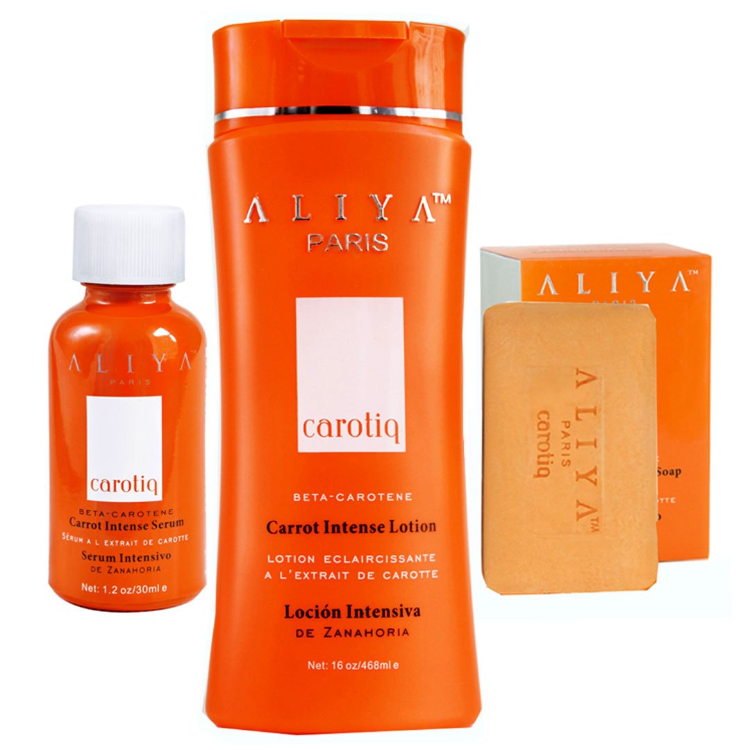 Aliya Lightening ( 24k Gold Triple Lightening Milk, serum And Whitening Soap ) Pack of 3 2 offers the essential body care trio. It includes the Whitening Soap, Lightening Milk, and Serum. This set focuses on all-over body whitening and radiance. The serum boosts the milk’s potency when mixed. The gold particles add shimmer and vitality. To use, cleanse, mix serum and milk, and apply.