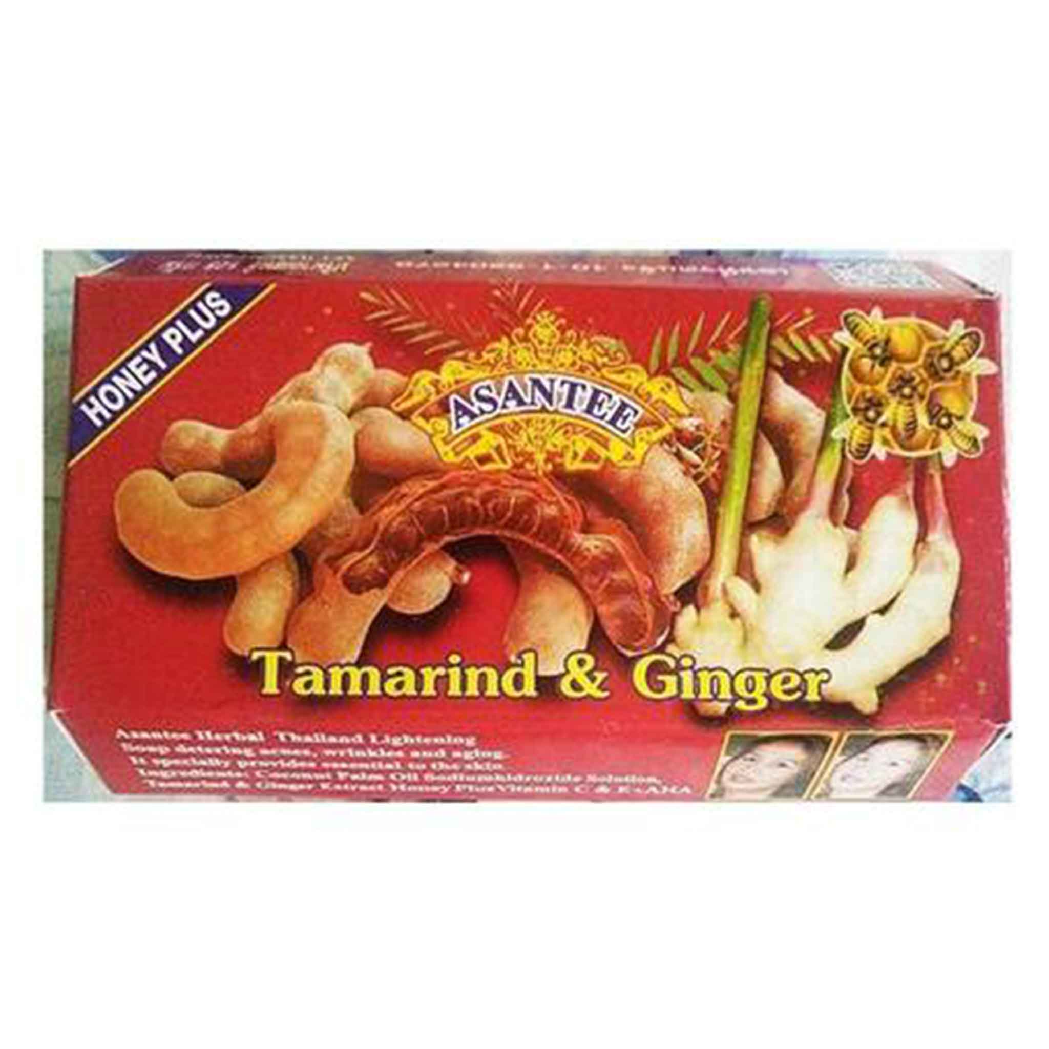 Asantee Herbal Tamarind & Ginger Soap Bar 135g 6packs blends Tamarind AHAs with stimulating Ginger. Tamarind exfoliates, while Ginger boosts circulation and fights bacteria. It helps to clear acne, rashes, and ringworm. It leaves the skin feeling energized and clean. To use, lather onto body. Rinse well. Regular use promotes healthy skin. Reginah.