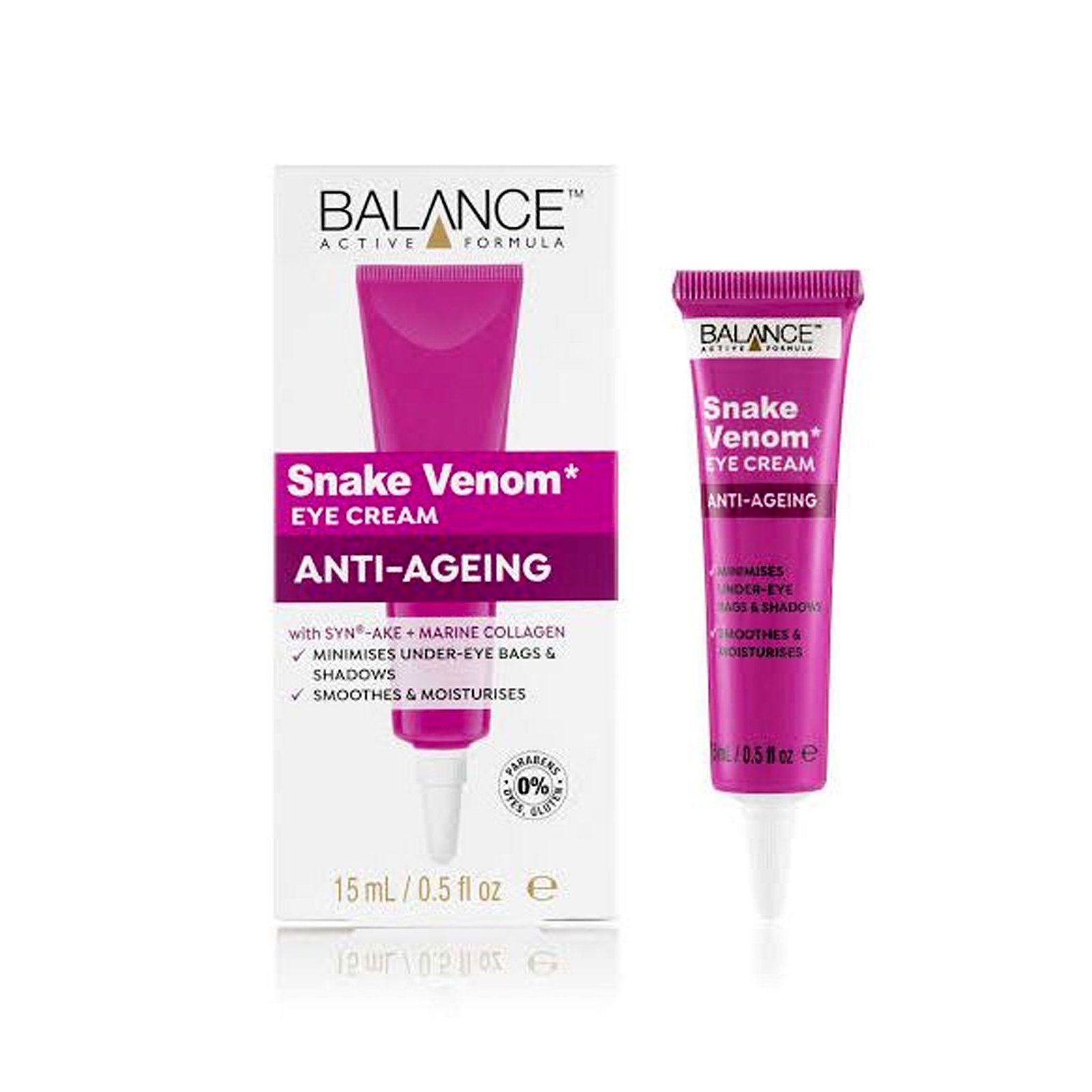 Balance Active Formula Snake Venom Eye Cream is a specialized facial treatment designed specifically to target the visible signs of aging around the delicate orbital area. This high-performance cream features the Syn-Ake complex, a peptide inspired by snake venom that works to “freeze” micro-contractions, effectively reducing the appearance of fine lines and wrinkles in a very short time.