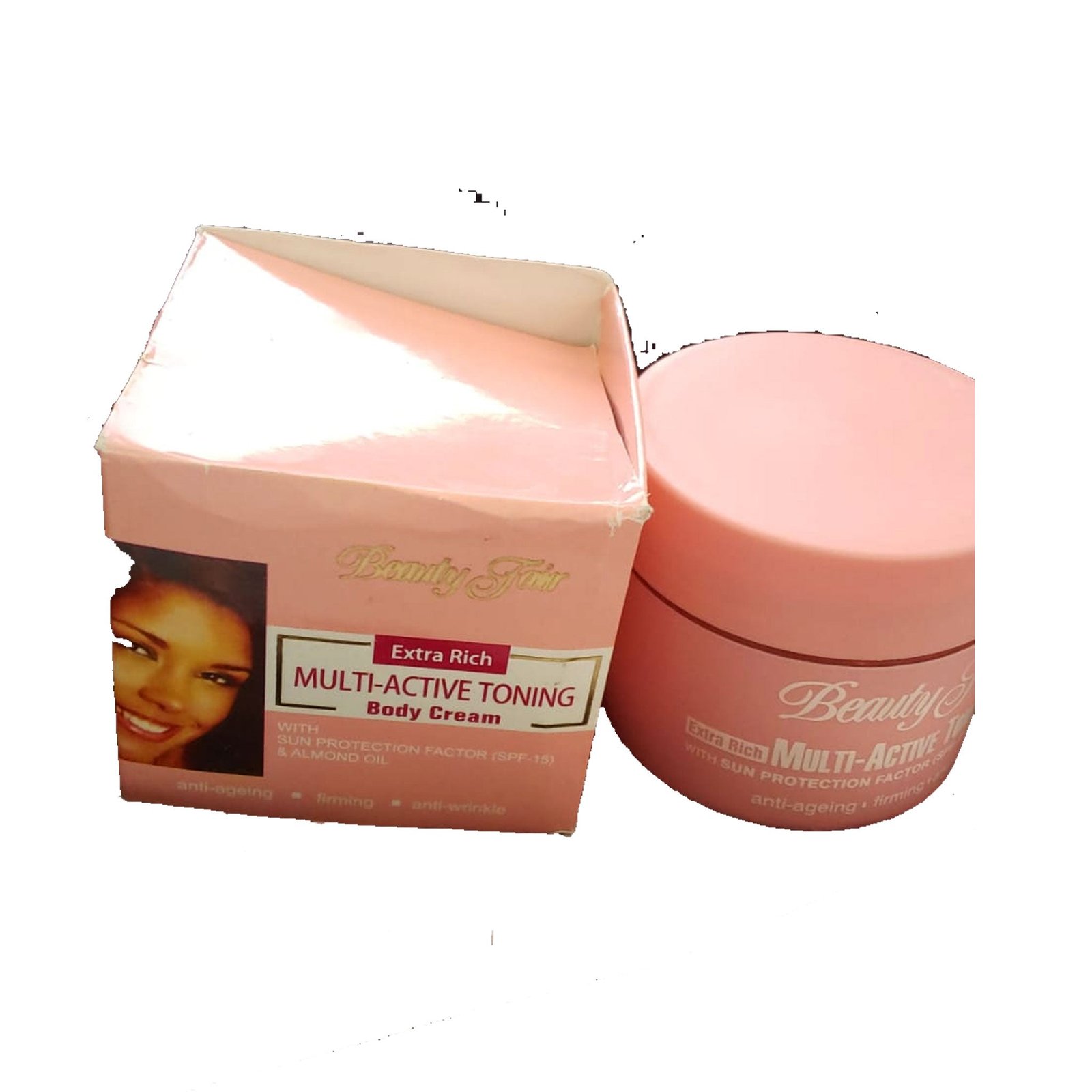 Beauty Fair Multi Active Toning Body Cream is a specialized skin-lightening treatment designed to provide a significantly brighter and more uniform complexion. This cream features a “Multi Active” formula that combines potent whitening agents with natural botanical extracts to target melanin production and restore a youthful brilliance.