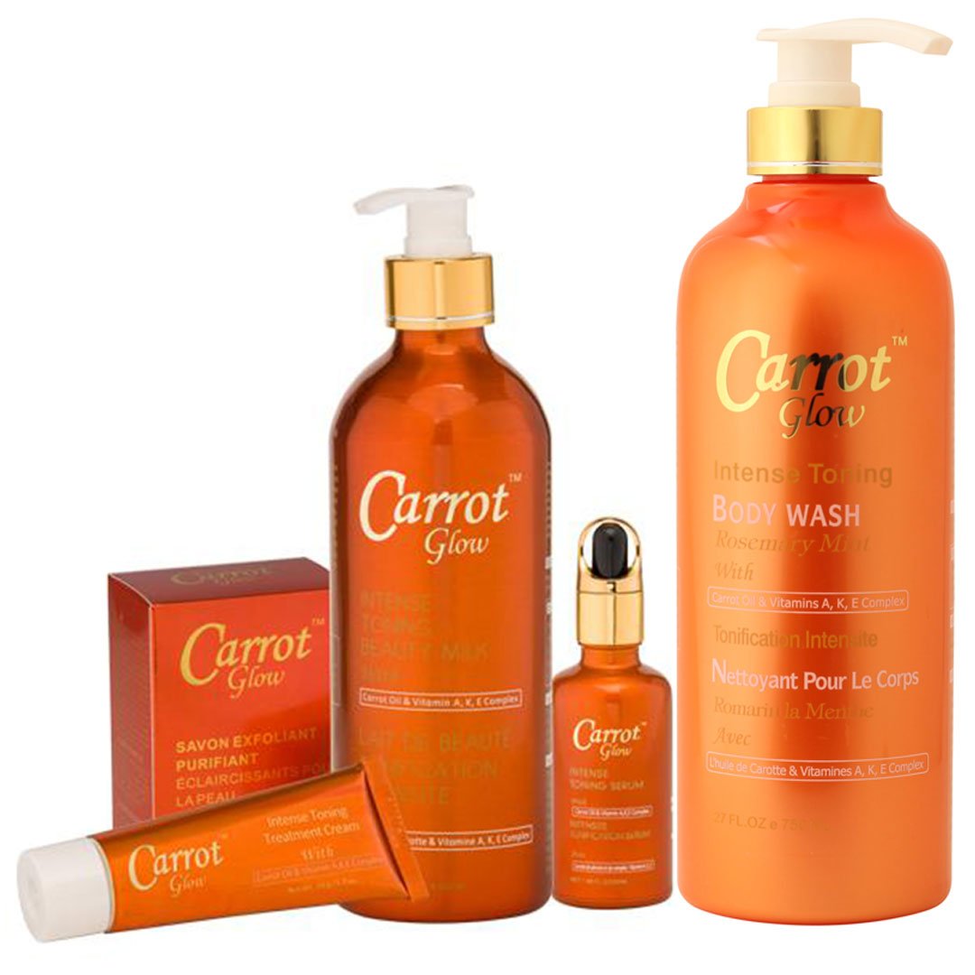 The Carrot Glow Pack of 5 is the ultimate collection for those who want a total skin overhaul. This expanded set includes five high-performance products: the Lightening Beauty Milk, Lightening Serum, Toning Treatment Cream, Exfoliating Body Wash, and the Lightening Soap. This kit is formulated with the signature blend of Carrot Oil and Vegeclairine, providing powerful whitening and anti-aging benefits.