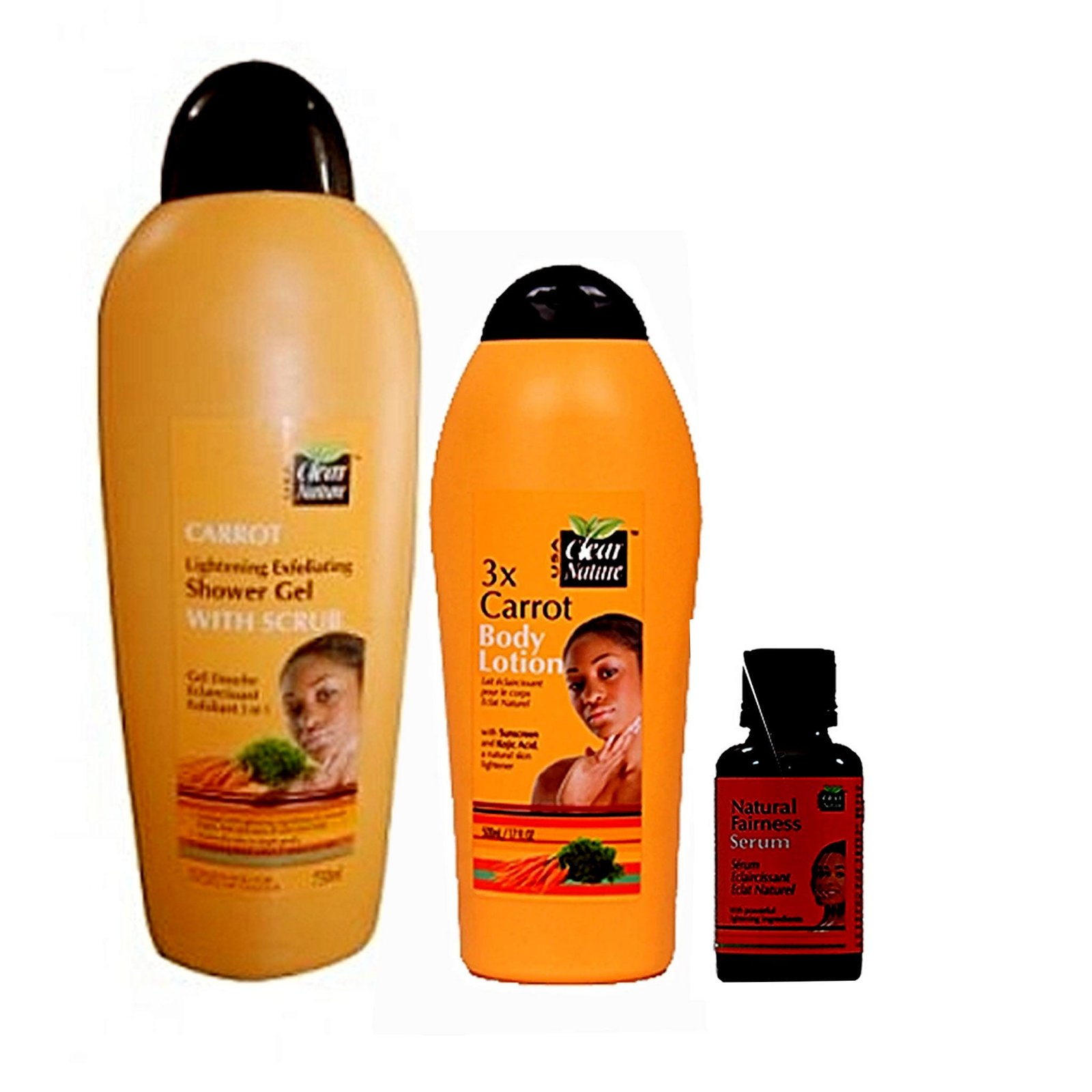 The Clear Nature Carrot (Carrot Lotion, Shower Gel And Carrot Soap) Pack of 3 is a complete skin-toning system designed for individuals who desire a professional-grade solution for a fair and healthy complexion. This set includes the high-potency Carrot Body Lotion, the exfoliating Shower Gel, and the clarifying Carrot Soap. All three products harness the natural power of high-quality carrot oil, which is rich in Beta-Carotene and Vitamin A, to rejuvenate the skin and promote a healthy radiance.