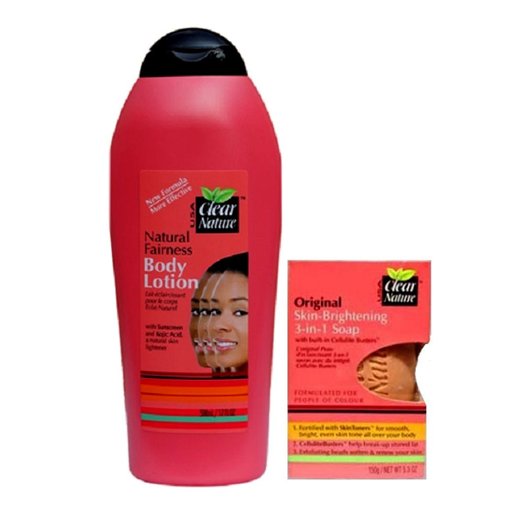 + Delivery in 24 Hours!Clear Nature Natural Fairness Pack of 3 is the 2-piece fairness set with Soap and Lotion that works together to inhibit melanin and fade dark spots for a radiant, fair body tone.