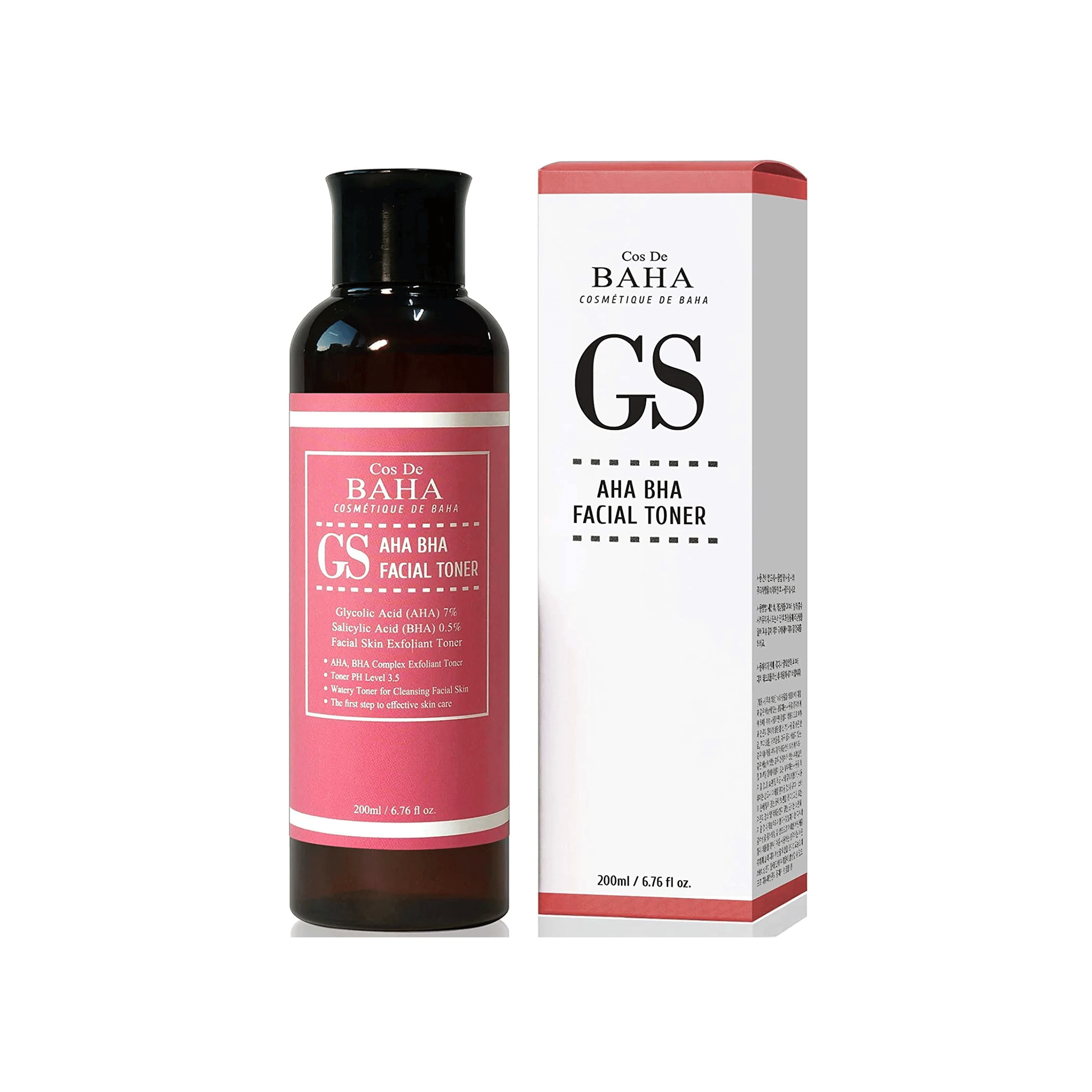 Cos de BAHA AHA BHA (GS) Exfoliating Facial Toner 200ml is a specialized treatment designed to chemically resurface the skin and clear the pores of deep-seated impurities. The primary benefit of this 200ml toner is the combination of 7% Glycolic Acid (AHA) and 0.5% Salicylic Acid (BHA). The AHA works on the skin’s surface to dissolve dead skin cells and fade dark spots, while the BHA penetrates deep into the oil-filled pores to eliminate the bacteria and debris that cause blackheads and acne.