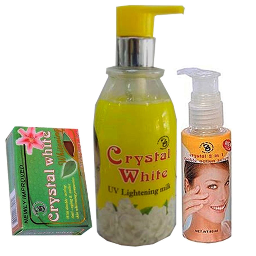 Crystal White Lightening ( Lotion, Serum And Bar Soap ) Pack of 3 2 is a streamlined whitening kit. It features the Bar Soap, Lotion, and Serum. The soap provides physical exfoliation to remove dead skin cells before the whitening agents are applied. It targets hyperpigmentation and dullness on the body. It leaves the skin feeling clean and looking radiant.