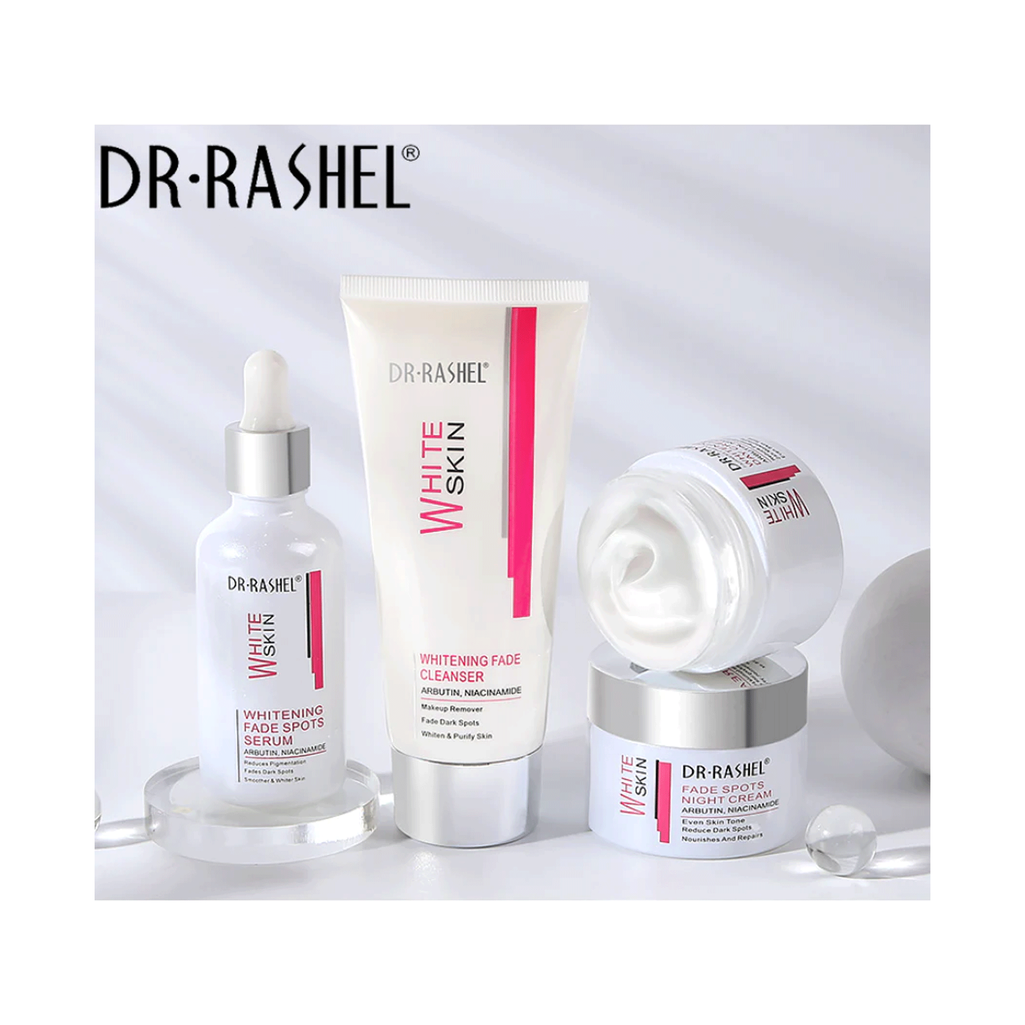 + Delivery in 24 Hours!Dr. Rashel White Skin Whitening Fade Spots 4 Piece Set is the complete 4-piece whitening regimen containing Cleanser, Toner, Serum, and Cream with Arbutin and Niacinamide to fade spots and unify skin tone.