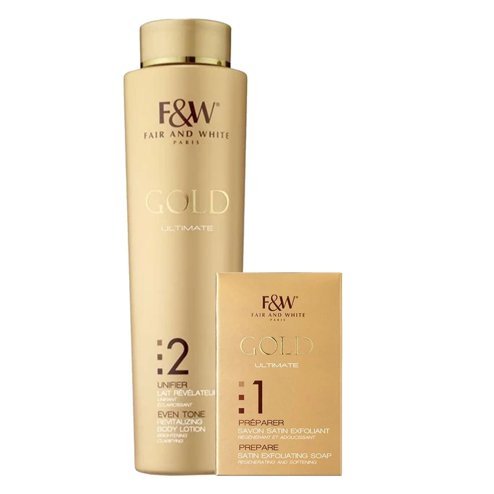 FAIR AND WHITE 2: GOLD 2Pc SETS is a premium body care system designed for significant skin lightening and a high-definition radiance finish. This specialized 2pc set features the elite Gold Exfoliating Soap and the high-potency Gold Body Milk. Both products in the FAIR AND WHITE 2: GOLD 2Pc SETS feature light-reflecting particles that impart an instant shimmering glow to the skin.