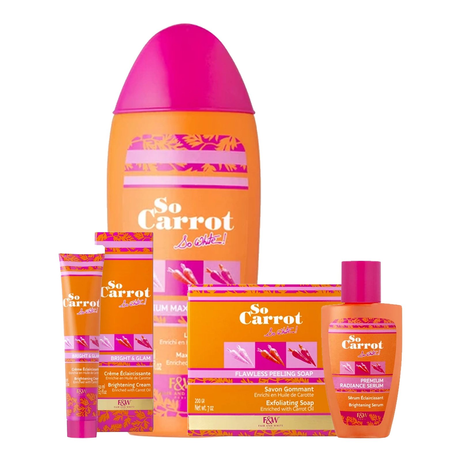 FAIR AND WHITE SO CARROT 4pc SETS is the ultimate high-performance skincare system designed for maximum skin tone correction and total body radiance through natural extracts. This comprehensive Pack of 3 of FAIR AND WHITE SO CARROT 4pc SETS features the Carrot Soap, a concentrated Toning Serum, a high-potency Body Lotion, and the Brightening Shower Gel.