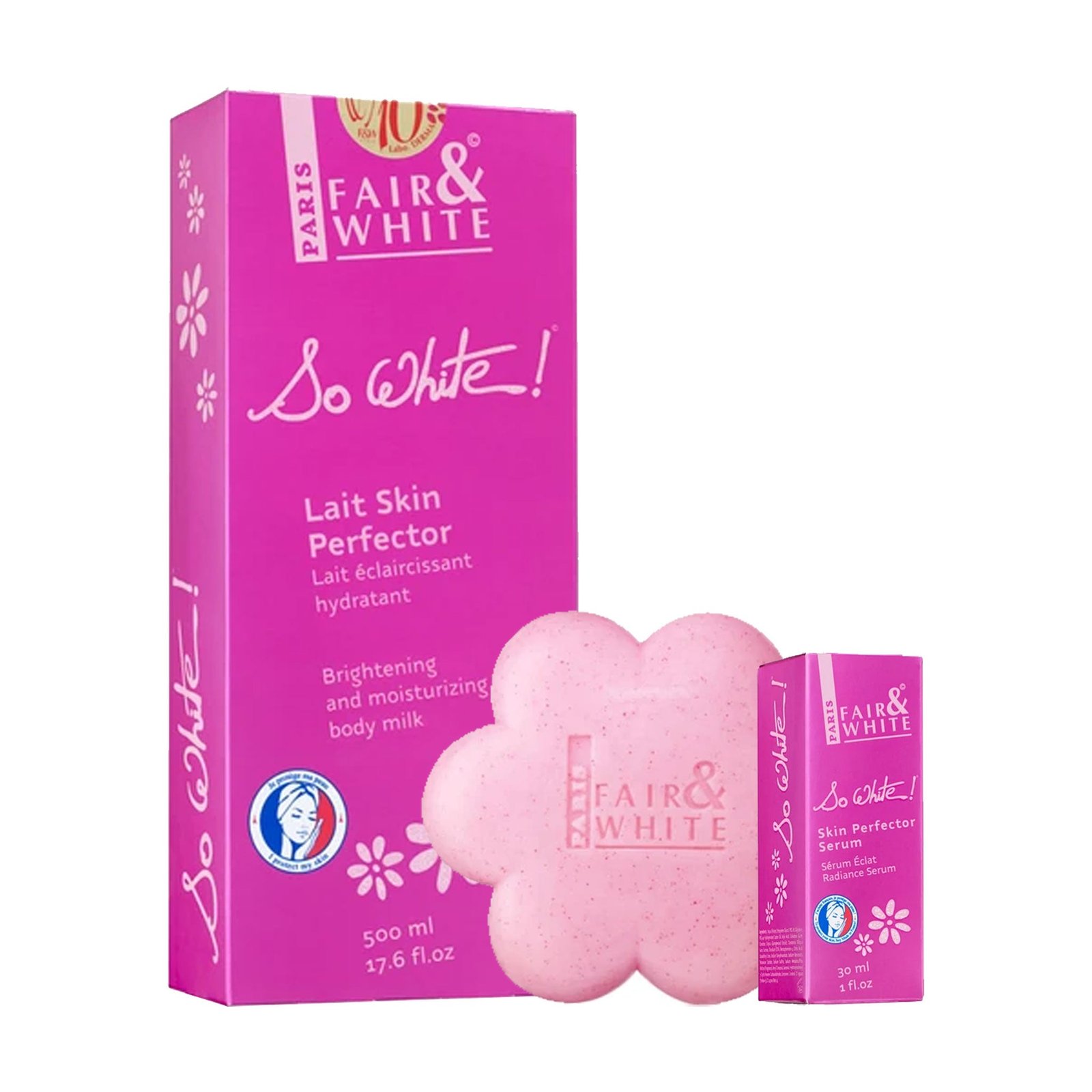 FAIR AND WHITE SO WHITE SKIN PERFECTOR 3pc SETS is the comprehensive body care regimen designed for significant skin tone correction and total body radiance. This Pack of 3 of FAIR AND WHITE SO WHITE SKIN PERFECTOR 3pc SETS features the specialized So White Soap, a concentrated Toning Serum, and the high-potency Body Milk. The system works synergistically to reveal the fairer complexion across the limbs and torso.