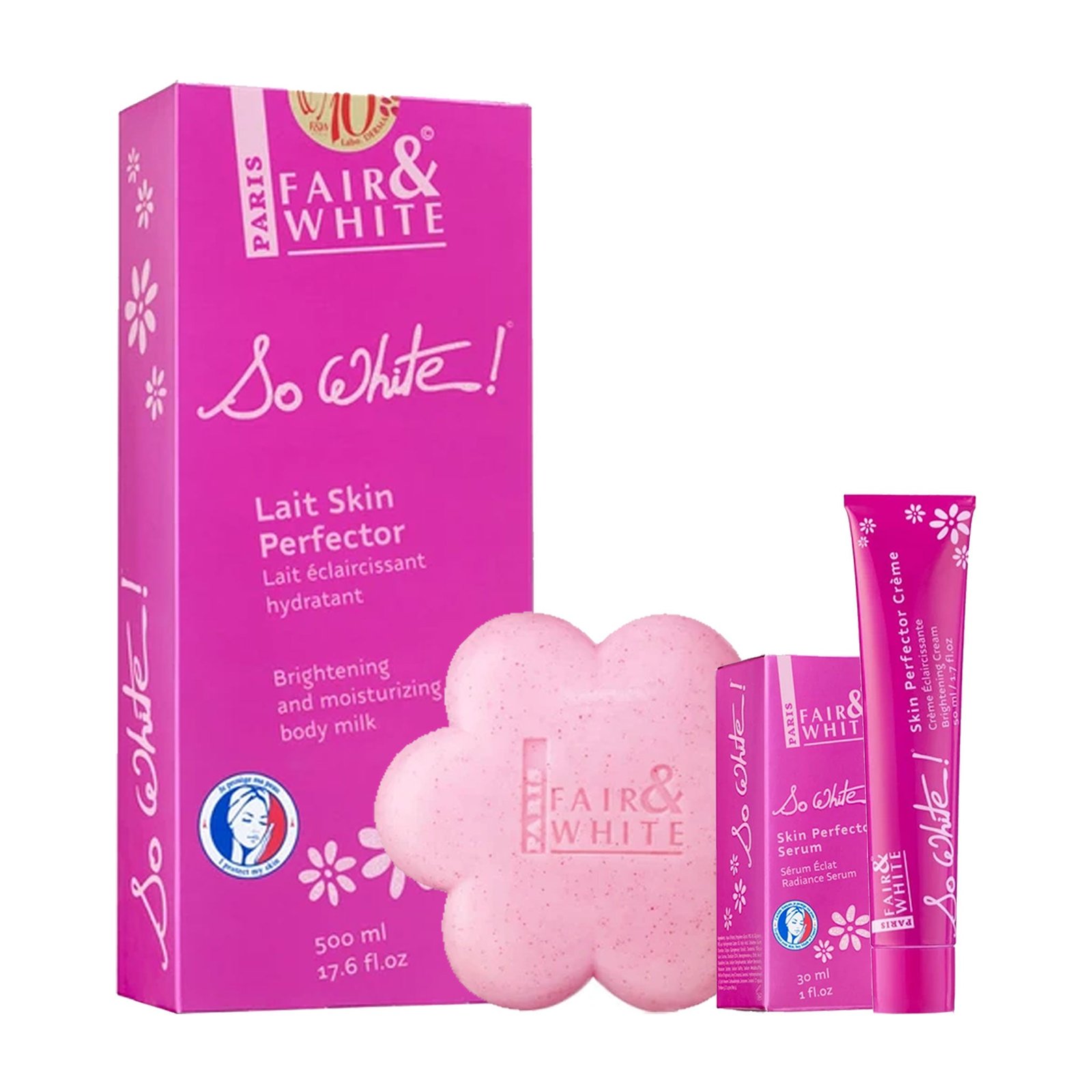 The entire system of FAIR AND WHITE SO WHITE SKIN PERFECTOR 4pc SETS is powered by advanced whitening agents that work to inhibit melanin production at the root, effectively fading stubborn dark spots, acne marks, and sun damage. The set provide the complete daily hygiene and treatment routine that targets hyperpigmentation at every step. It begins with the soap, which deep-cleanses the pores and preps the skin for the concentrated serum and lotion. The tube cream in FAIR AND WHITE SO WHITE SKIN PERFECTOR 4pc SETS is specifically engineered to treat resistant dark joints like knuckles and elbows. The system provides intensive 24-hour hydration to prevent the dryness associated with whitening treatments, ensuring the whole body remains soft and supple. Regular use of the entire FAIR AND WHITE SO WHITE SKIN PERFECTOR 4pc SETS results in the visibly fairer, clearer, and more uniform appearance from head to toe. Reginah.com ensures delivery of your premium beauty products to your designated address in approximately 24 to 48 hours, keeping your skin journey on track.