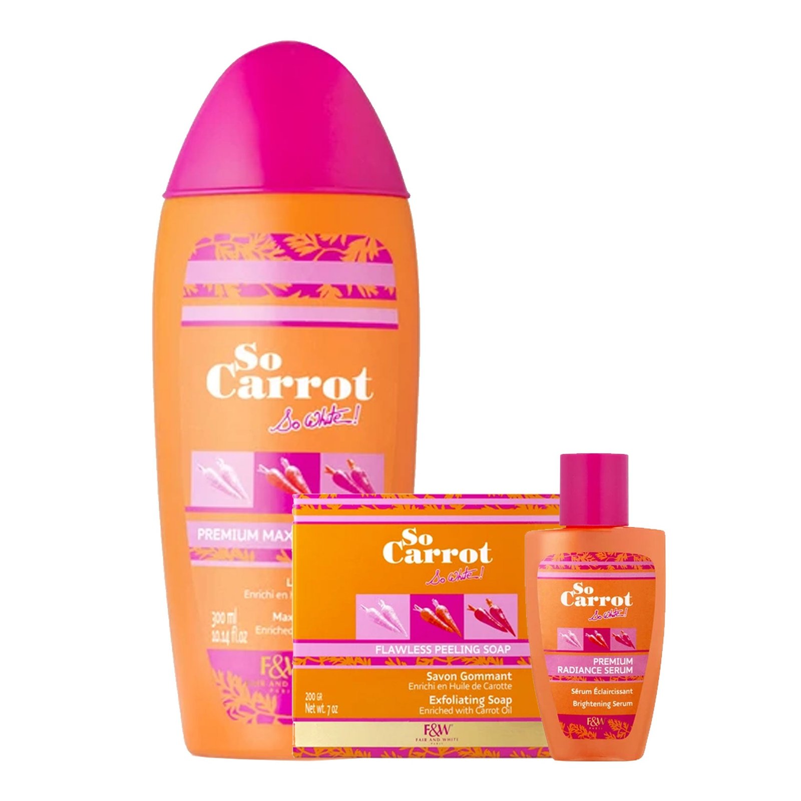 + Delivery in 24 Hours!Fair & White So Carrot 3-Pc Skincare Set for Radiant Glow is the 3-piece whitening set with Carrot Oil that inhibits melanin for the radiant, fair body tone.
