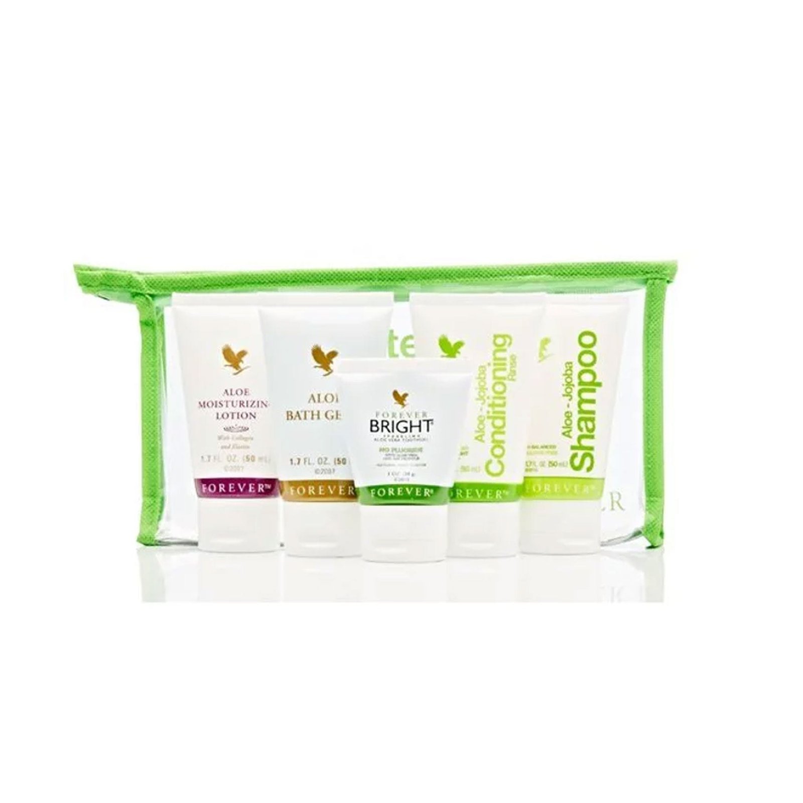 + Delivery in 24 Hours!Travel kit with mini Forever Living Aloe Vera essentials including shampoo, conditioner, and moisturizer.