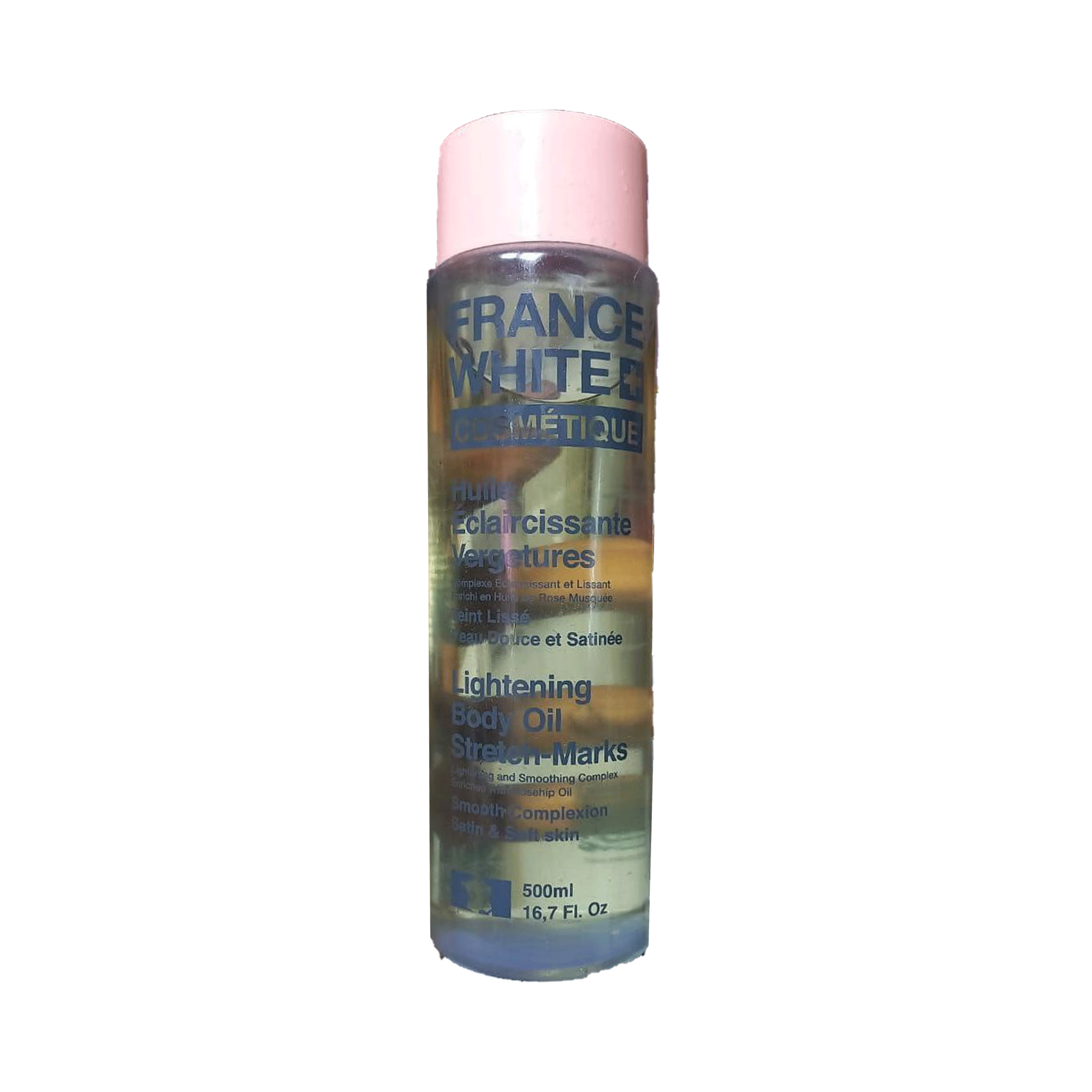 FRANCE WHITE LIGHTENING BODY OIL STRETCH MARKS is a specialized formula developed to reduce the appearance of stretch marks and scars. It combines regenerative oils with lightening agents to improve skin elasticity and fade the discoloration associated with stretch marks. The oil penetrates deep into the dermis to repair the skin structure and smooth the surface texture.