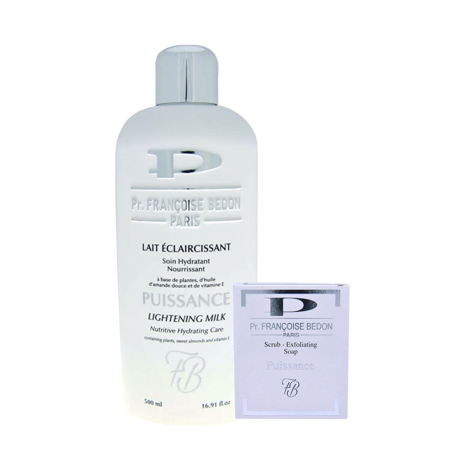 The Francoise Bedon Puissance (Lotion and Soap) Pack of 3 is an essential duo designed for individuals who seek a simple yet high-performance whitening routine. This set includes the 500ml Puissance Lightening Body Lotion and the Exfoliating Soap. Formulated with a potent blend of botanical whitening agents and active vitamins, the “Puissance” formula targets hyperpigmentation and dull skin tone across the whole body.