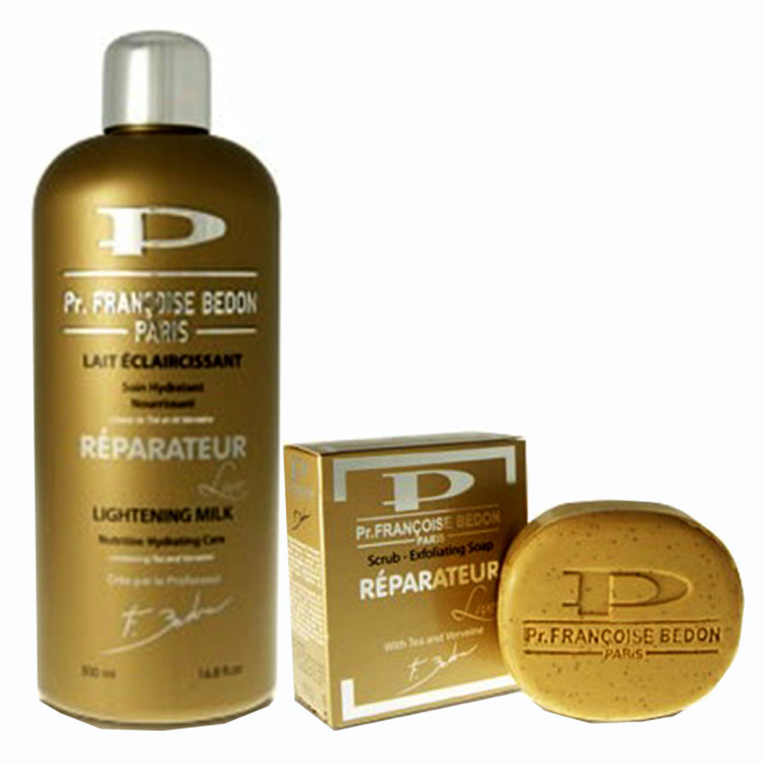 + Delivery in 24 Hours!Francoise Bedon Reparateur ( Lotion And Soap ) Pack of 3 is the 2-piece whitening set with Lotion and Soap that inhibits melanin and repairs skin for a fair, radiant, and unified body tone.