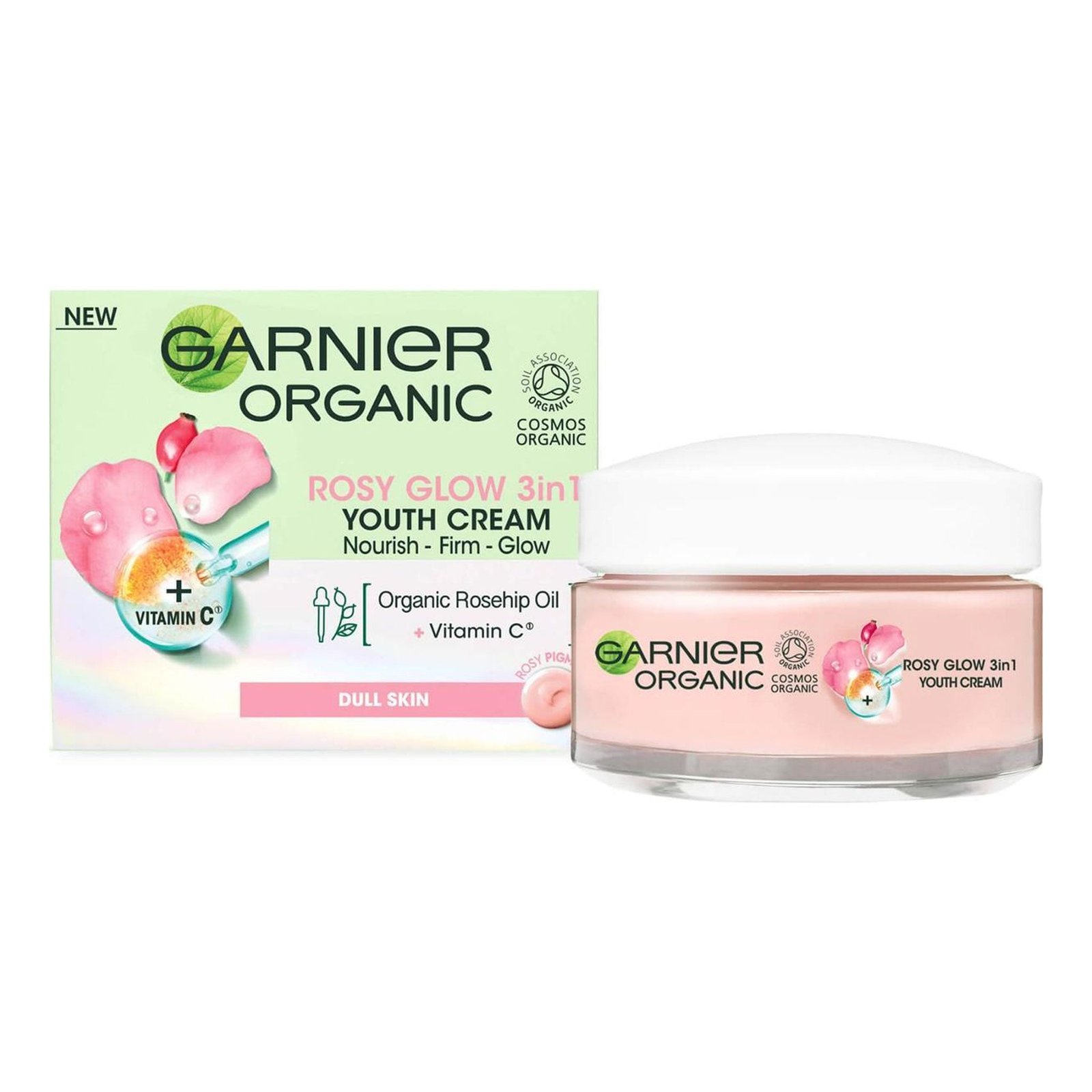 Garnier Organic Rosy Glow 3in1 Youth Cream is the high-performance facial treatment designed for intensive skin rejuvenation and tone correction. This 3in1 formula of Garnier Organic Rosy Glow 3in1 Youth Cream features organic Rosehip Oil and Vitamin C to provide the multi-benefit approach to beauty. Rosehip oil is naturally rich in essential fatty acids and antioxidants that repair damaged skin tissue and stimulate collagen production.