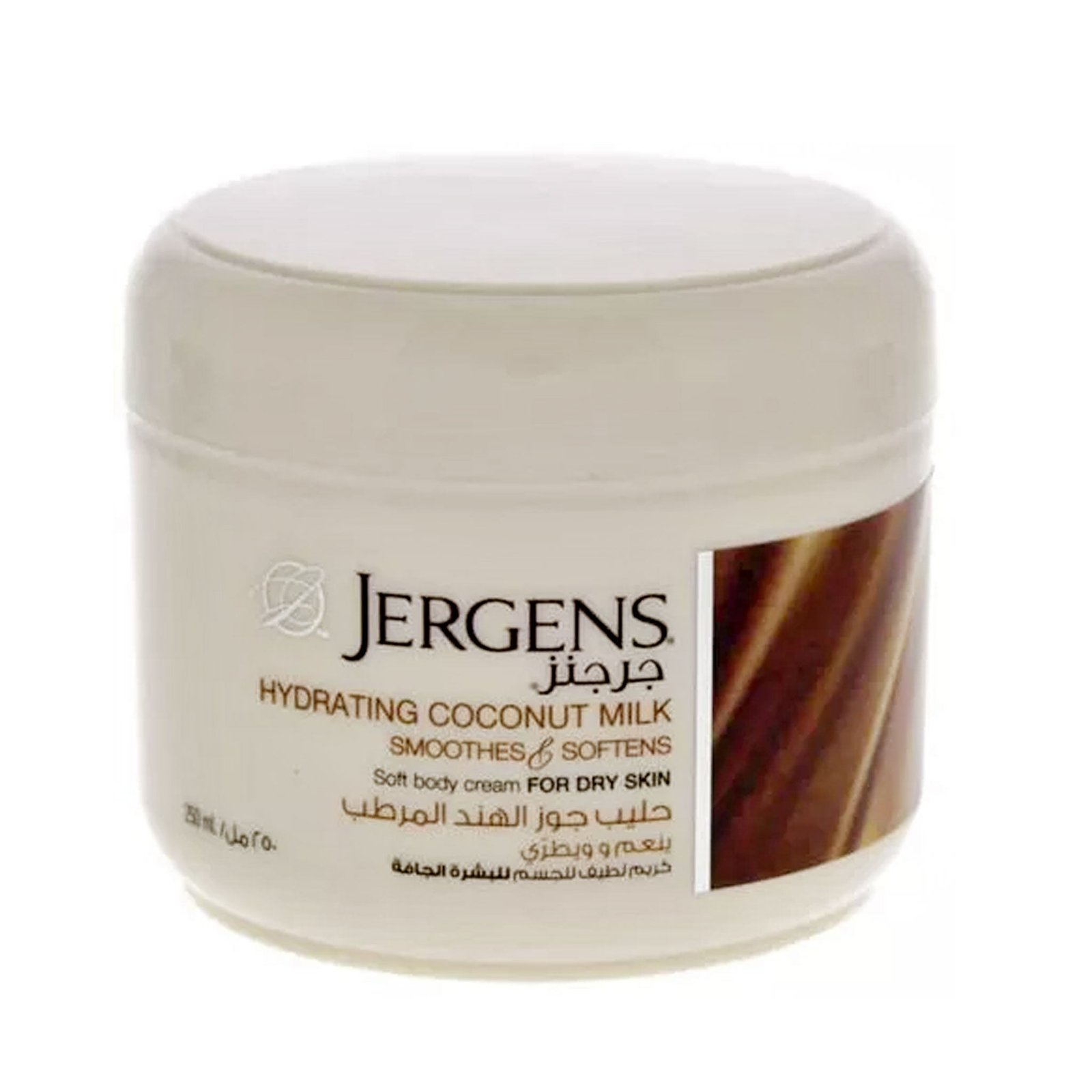 Jergens Hydrating Coconut Body Cream is a rich and intensive moisturizing treatment designed to rescue and protect very dry, rough skin. This premium cream features a highly concentrated blend of pure Coconut oil and Coconut water that penetrates deep into the skin’s surface to provide immediate relief and long-lasting softness. It works by creating a protective barrier that locks in moisture, helping to smooth out skin texture and improve elasticity across your entire body.
