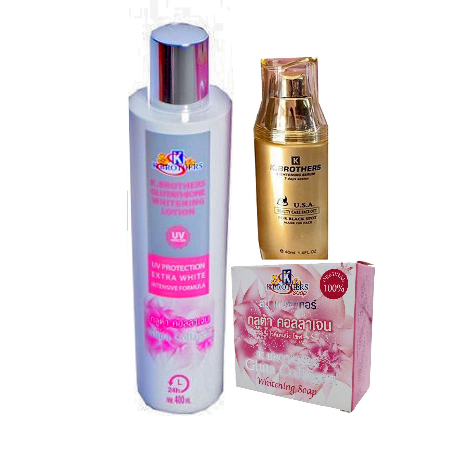 + Delivery in 24 Hours!K. Brothers Glutathione Pack of 3. is the 3-piece whitening set with Glutathione that inhibits melanin and detoxifies skin for a clear, radiant, and unified body tone.