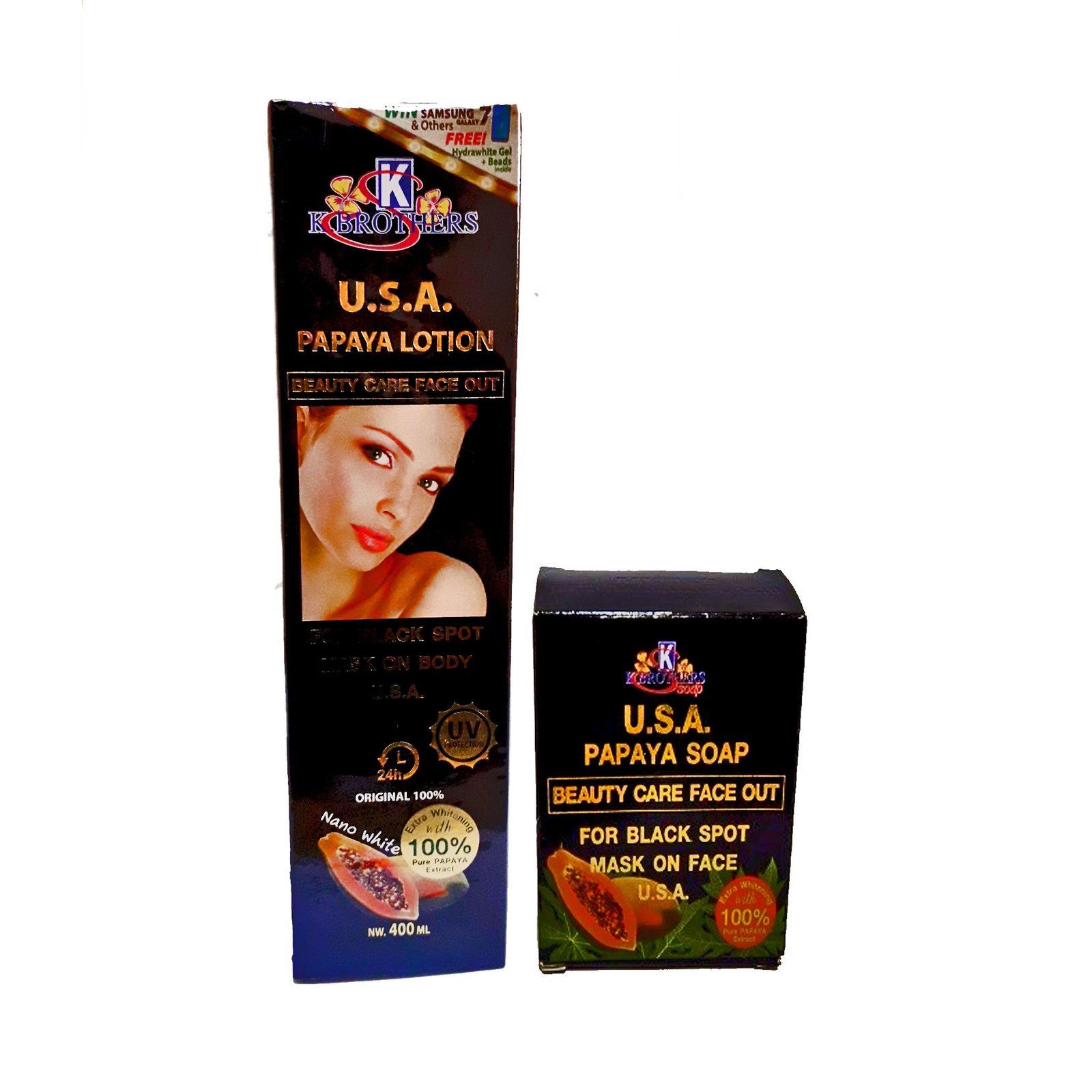 + Delivery in 24 Hours!K. Brothers Papaya ( Body Lotion And Bar Soap ) Pack of 3. is the 2-piece whitening set with Papaya extract that exfoliates dead skin and inhibits melanin for a fair, radiant, and unified body tone.