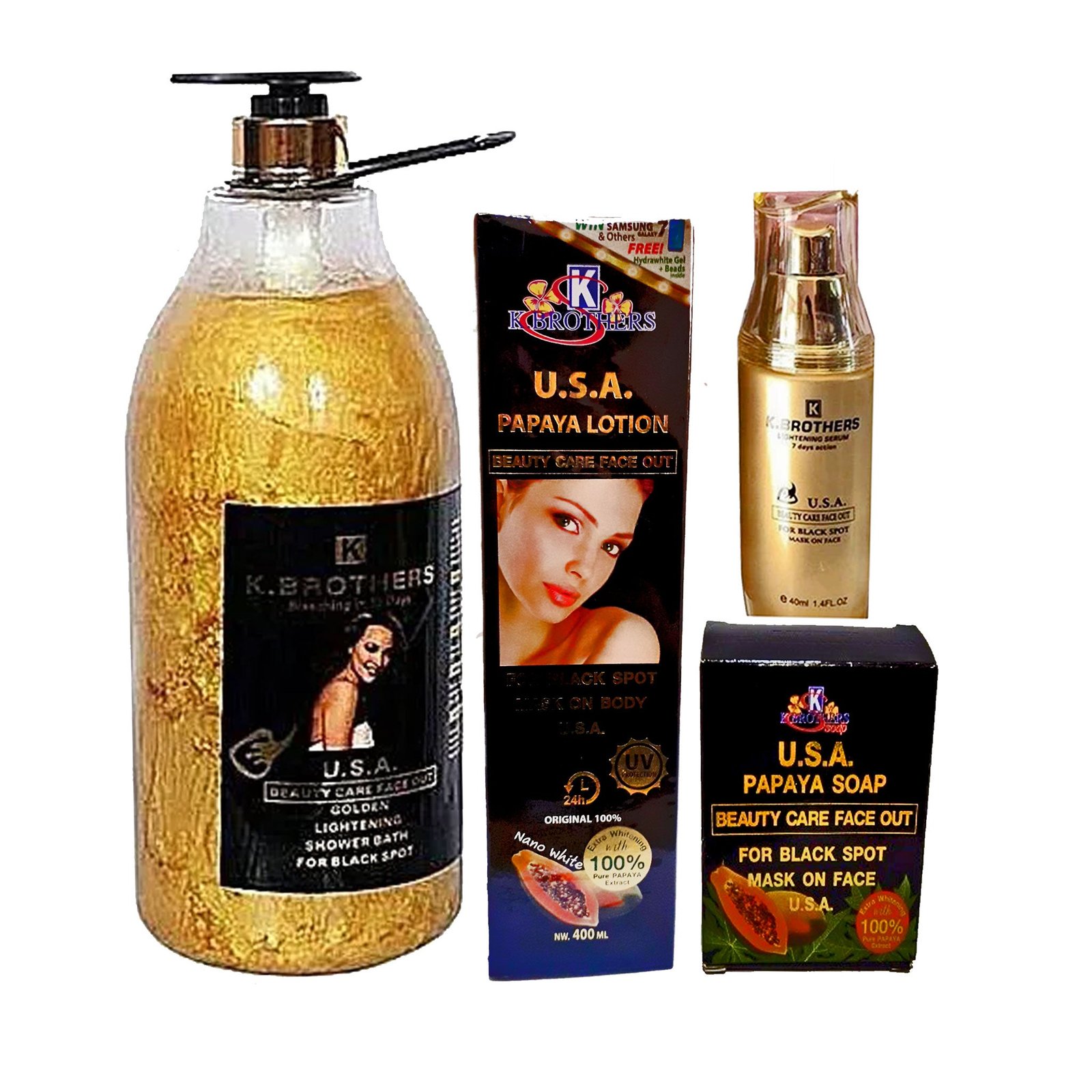 + Delivery in 24 Hours!K. Brothers Papaya ( Body Lotion, serum, Shower Gel And Soap ) Pack of 3. is the 4-piece whitening set with Papaya extract that exfoliates dead skin and inhibits melanin for a fair, radiant, and unified body tone.