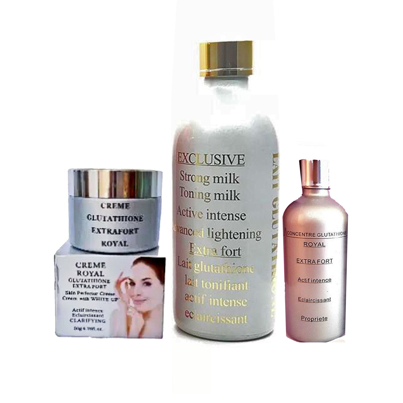 + Delivery in 24 Hours!The complete 3-piece whitening set from Lait Glutathione Royal featuring lotion, serum, and soap for intensive body brightening.