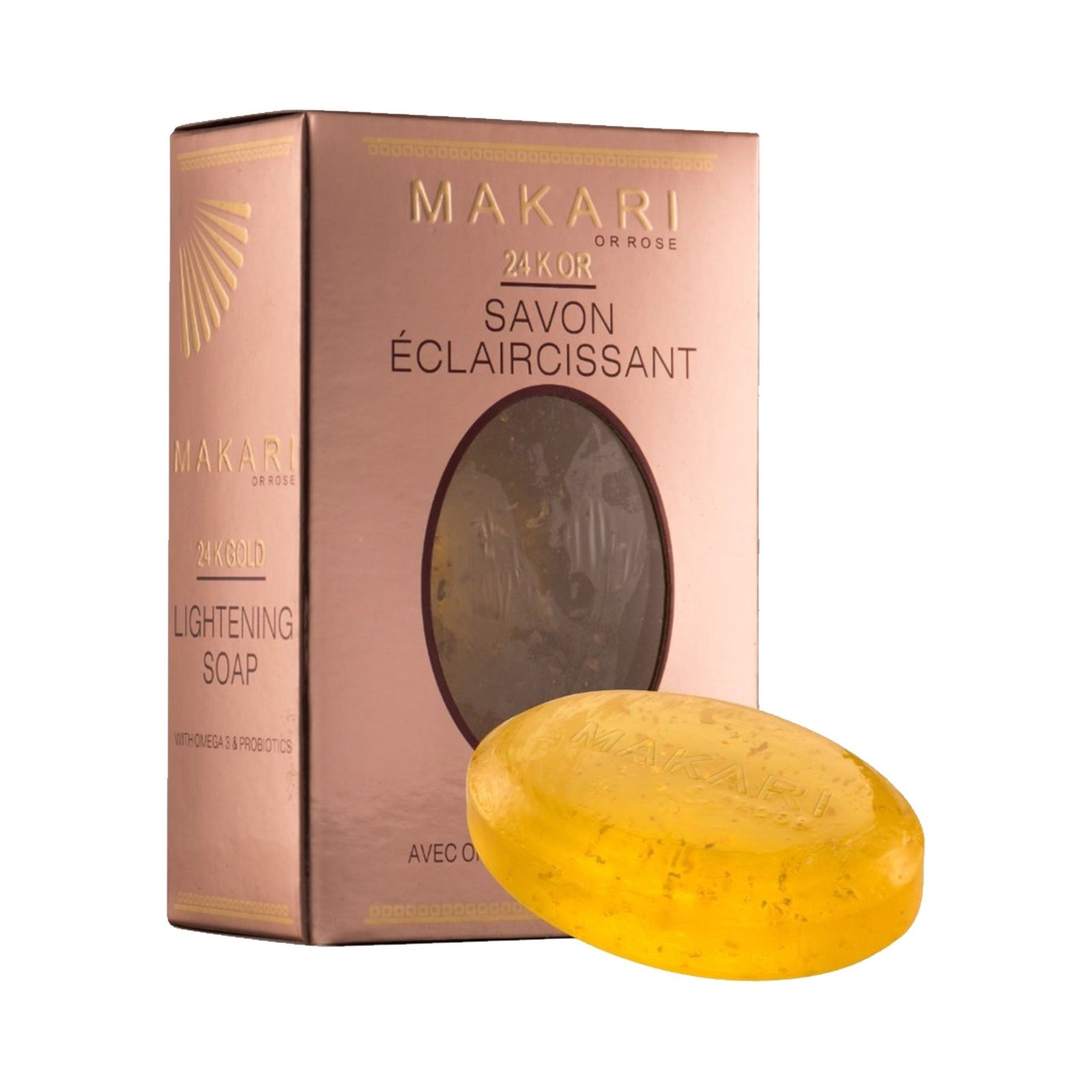 Makari 24K Gold Lightening Soap is the ultimate luxury cleansing bar for those seeking a radiant and flawless complexion. This soap is infused with real 24K Gold particles, which help to stimulate skin cells and provide a spectacular shimmering glow. The primary whitening ingredient is Organiclarine, a non-chemical, proprietary blend of botanical brightening agents that effectively inhibits melanin without the use of harsh hydroquinone.