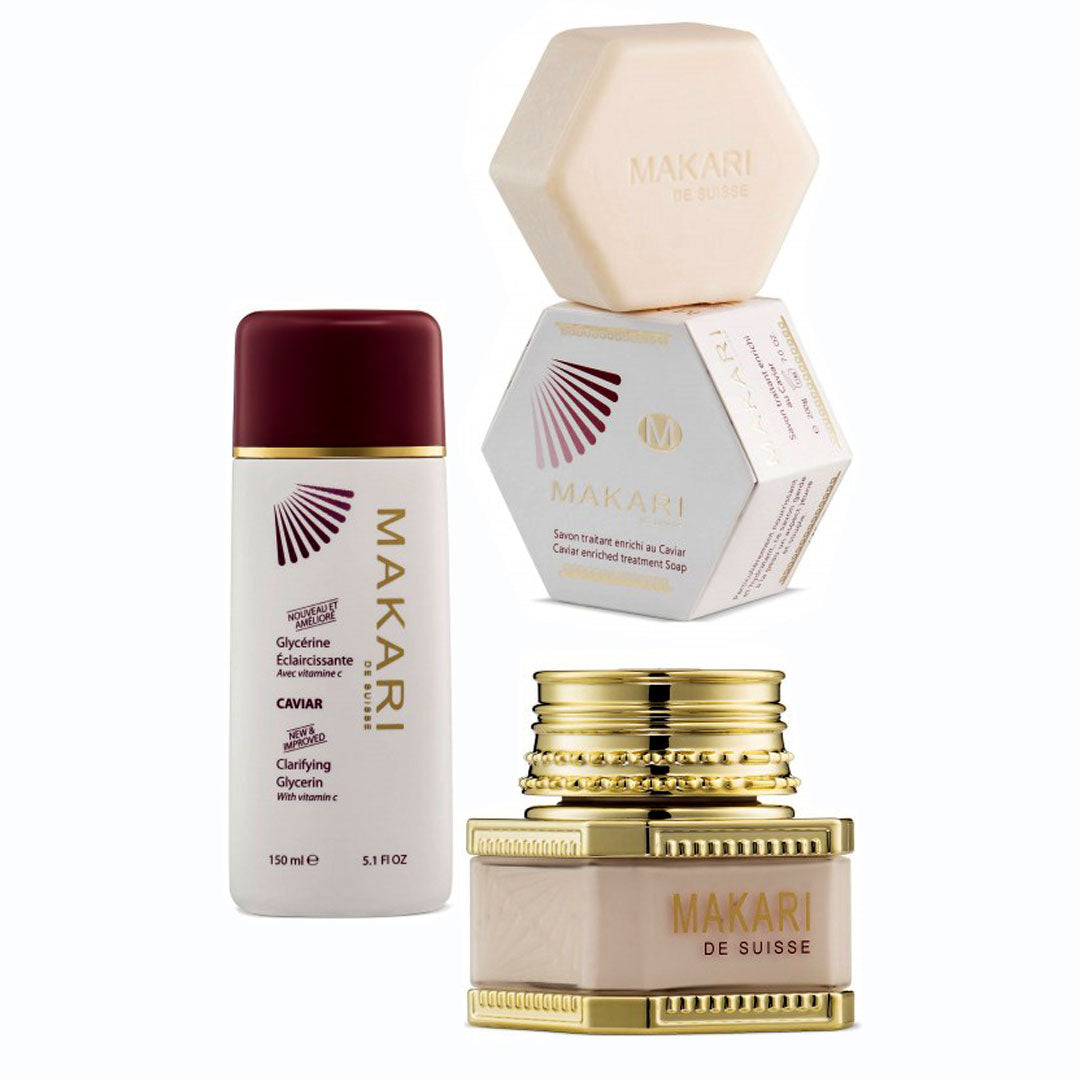 The Makari Caviar Pack of 3 is a premium skincare regimen designed for intensive hydration, anti-aging, and skin lightening. This set includes the Clarifying Body Milk, the Clarifying Glycerin, and the Enriched Soap. Formulated with high-quality Caviar extract, it is exceptionally rich in vitamins and minerals that nourish the skin at a cellular level.