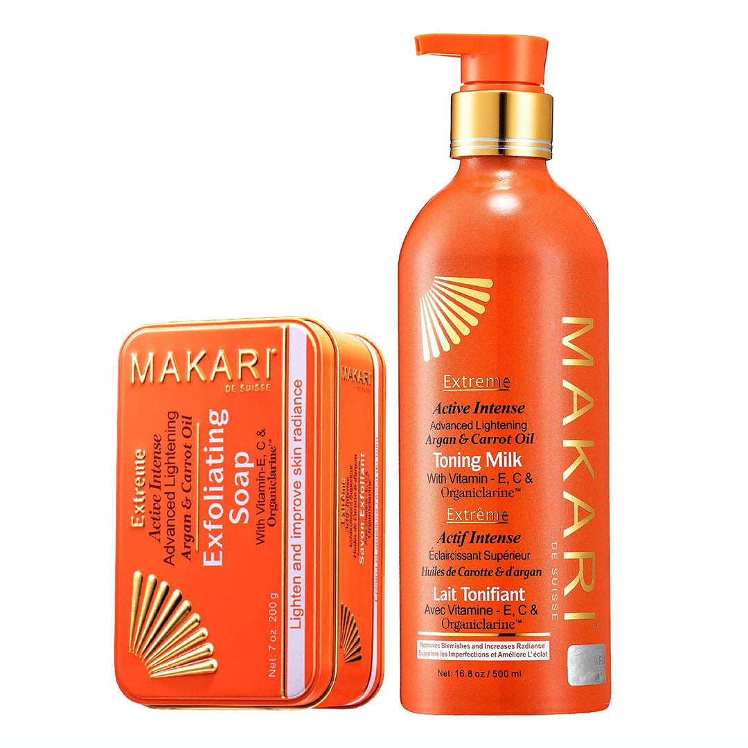 The Makari Extreme Argan & Carrot (Body Lotion, Soap) Pack of 3 is a powerful whitening duo designed to provide a radiant and unified skin tone. This set includes the 500ml Toning Body Milk and the Active Intense Soap. Formulated with the signature blend of Carrot Oil, Argan Oil, and Organiclarine, it targets dullness and hyperpigmentation across the whole body.