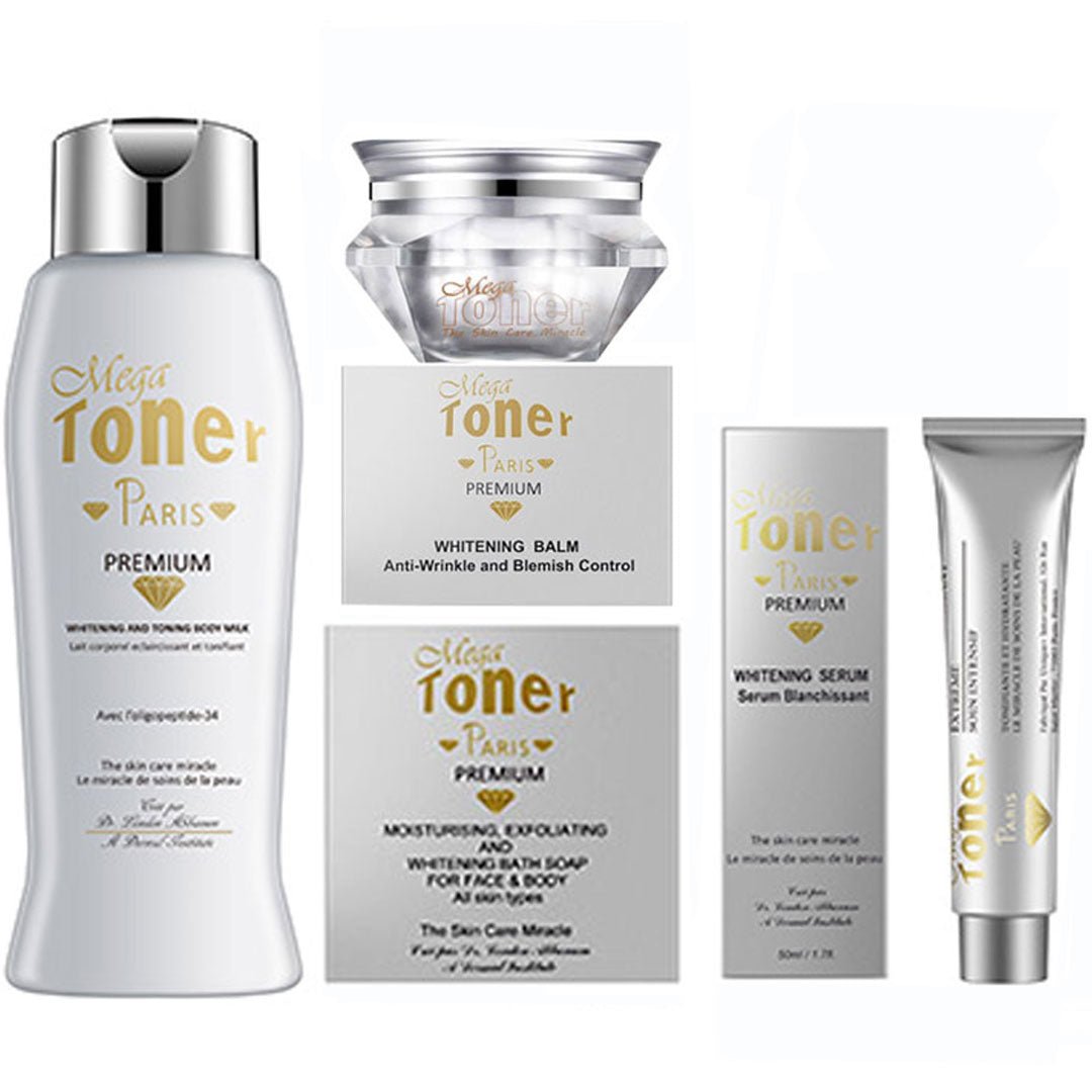 The Mega Toner Paris Whitening Toning (Body Milk, Serum, Balm And Bath Soap) Pack of 3 is a high-intensity beauty system designed for individuals seeking significant results across the entire body. This set includes four essential products: a 500ml Whitening Body Milk, a concentrated Serum, a targeted Balm for spots, and an exfoliating Bath Soap.