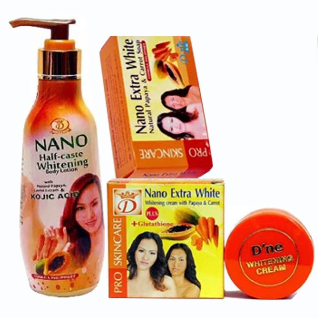 The Nano Bar (Soap, Lotion And face cream) Pack of 3 is a highly effective whitening regimen designed for individuals seeking significant results across the entire body. This set includes the Extra White Soap, the powerful Body Lotion, and the targeted Face Cream. Formulated with a potent blend of Papaya and Carrot extracts along with active whiteners, it provides a synergistic approach to skin lightening.