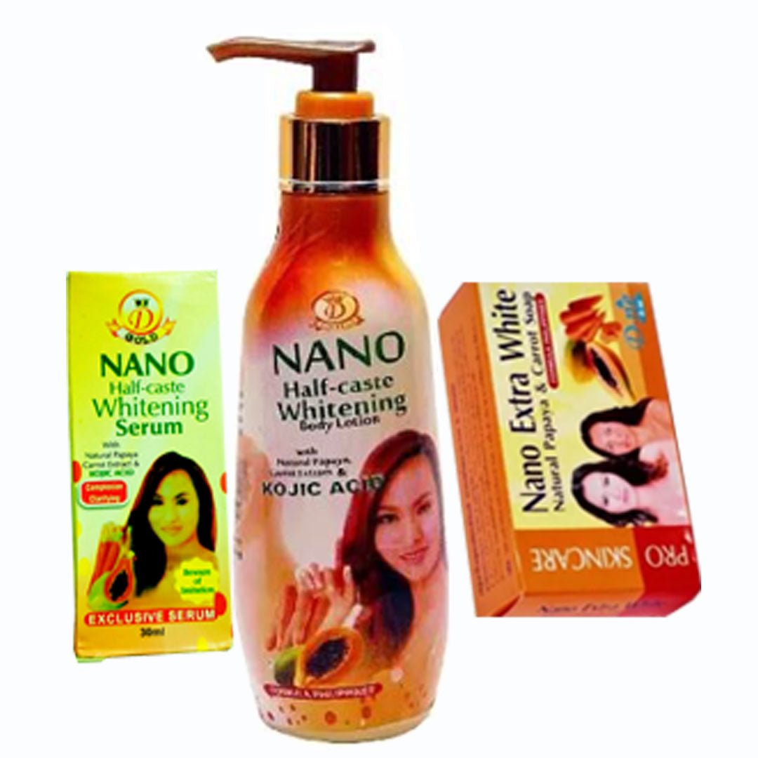 The Nano Bar (Soap, Lotion And Serum) Pack of 3 is an intensive whitening regimen designed for individuals seeking rapid and significant results on the body. This set includes the Extra White Soap, the powerful Body Lotion, and the high-potency Serum booster. Formulated with a blend of active whitening agents and botanical extracts, it targets melanin production and hyperpigmentation aggressively.