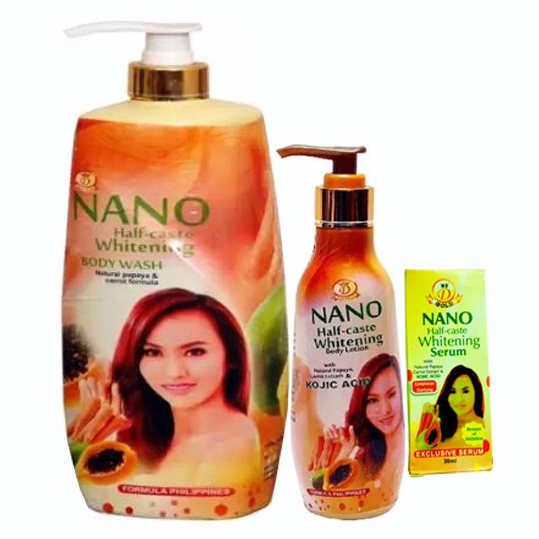 The Nano Whitening (Lotion, Body Wash And Serum) Pack of 3 is a premium skin-lightening system designed for those who prefer a liquid body wash over traditional bars. This set includes a 500ml Whitening Body Wash, a powerful Body Lotion, and a concentrated Serum booster. Formulated with a potent blend of Glutathione, Kojic Acid, and vitamins, it offers a powerful solution for total body whitening.