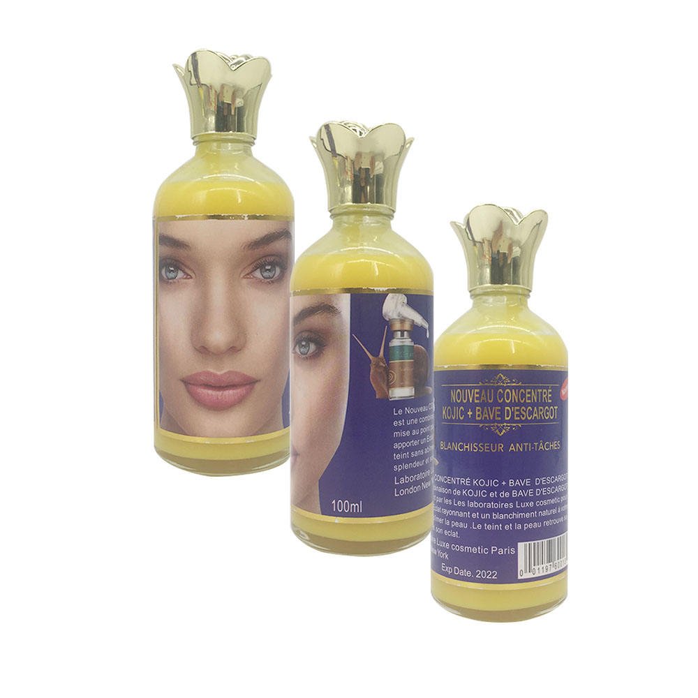 Nouveau Concentre Kojic+Bave Descargot Blanchisseur Anti-taches Whitening Serum combines Kojic Acid with Snail Slime (Bave Descargot). Kojic acid whitens, while snail slime repairs and regenerates the skin. This concentrate targets stubborn spots and scars. It is ideal for mixing into body lotions. Reginah.com will bring it to your residence within 24 to 48 hours.