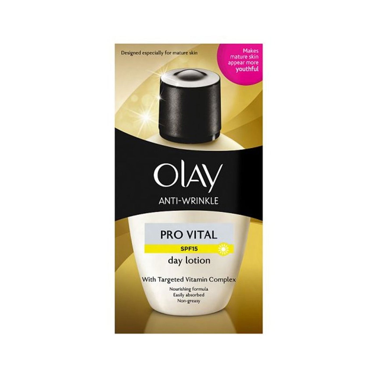 Olay Anti-Wrinkle Pro Vital SPF15 Day Lotion (100ml) is a specialized facial treatment designed for mature skin. This high-performance moisturizer is formulated with a multi-vitamin blend of B3, E, and Pro-Vitamin B5 that provides intensive nourishment and repair. It is specifically engineered to “Pro Vitalize” mature skin by improving its resilience and density.