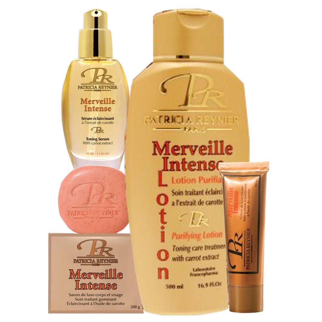 The Patricia Reyner Merveille Intense Pack of 3 is the ultimate collection in the Merveille range, designed for a total head-to-toe skin transformation. This comprehensive kit includes the Body Milk, high-potency Serum, targeted Tube Cream, and the clarifying Soap. Formulated with a high concentration of botanical whitening agents and active vitamins, it targets the toughest hyperpigmentation issues from head to toe.