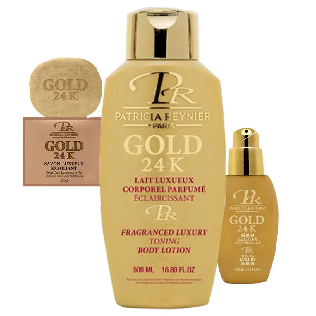 The Patricia Reynier Gold 24K (Lotion, Serum and Soap) 1KG Set is the ultimate and most luxurious beauty system in the Patricia Reynier range. This massive set is designed for individuals committed to a total skin overhaul and includes the Gold Body Milk, the concentrated Serum, and the clarifying Soap, providing a huge supply of premium care. Formulated with real 24K Gold particles and high-strength botanical whitening agents, it offers a sophisticated approach to skin lightening.