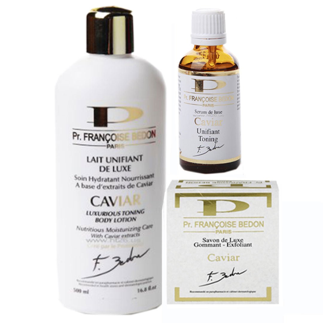 Pr. Francoise Bedon Caviar Lightening ( Lotion, Serum And Soap ) Set Pack of 3 is a premium clinical skincare system designed for intensive skin tone correction and anti-aging repair. This comprehensive Pack of 3 features a Caviar-enriched Soap, a high-potency Body Milk, and a concentrated Toning Serum. The formula is enriched with pure Caviar extract, which is naturally abundant in proteins, minerals, and essential fatty acids to rejuvenate tired skin.
