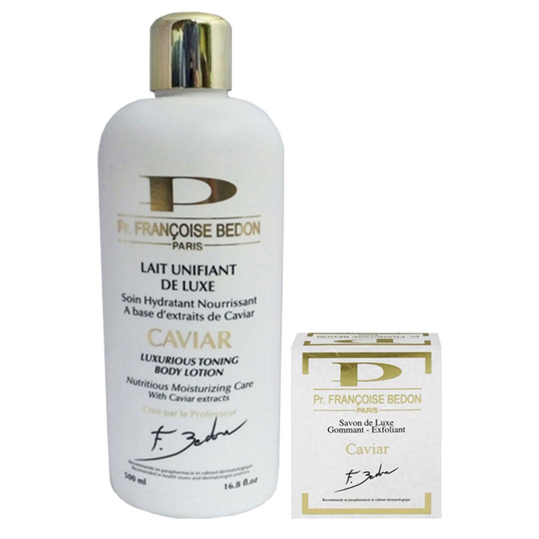 + Delivery in 24 Hours!Pr. Francoise Bedon Caviar ( Lotion And Soap ) Pack of 3 is the luxury 2-piece skincare set with Caviar extract that nourishes, improves elasticity, and lightens dark spots for a flawless, youthful complexion.