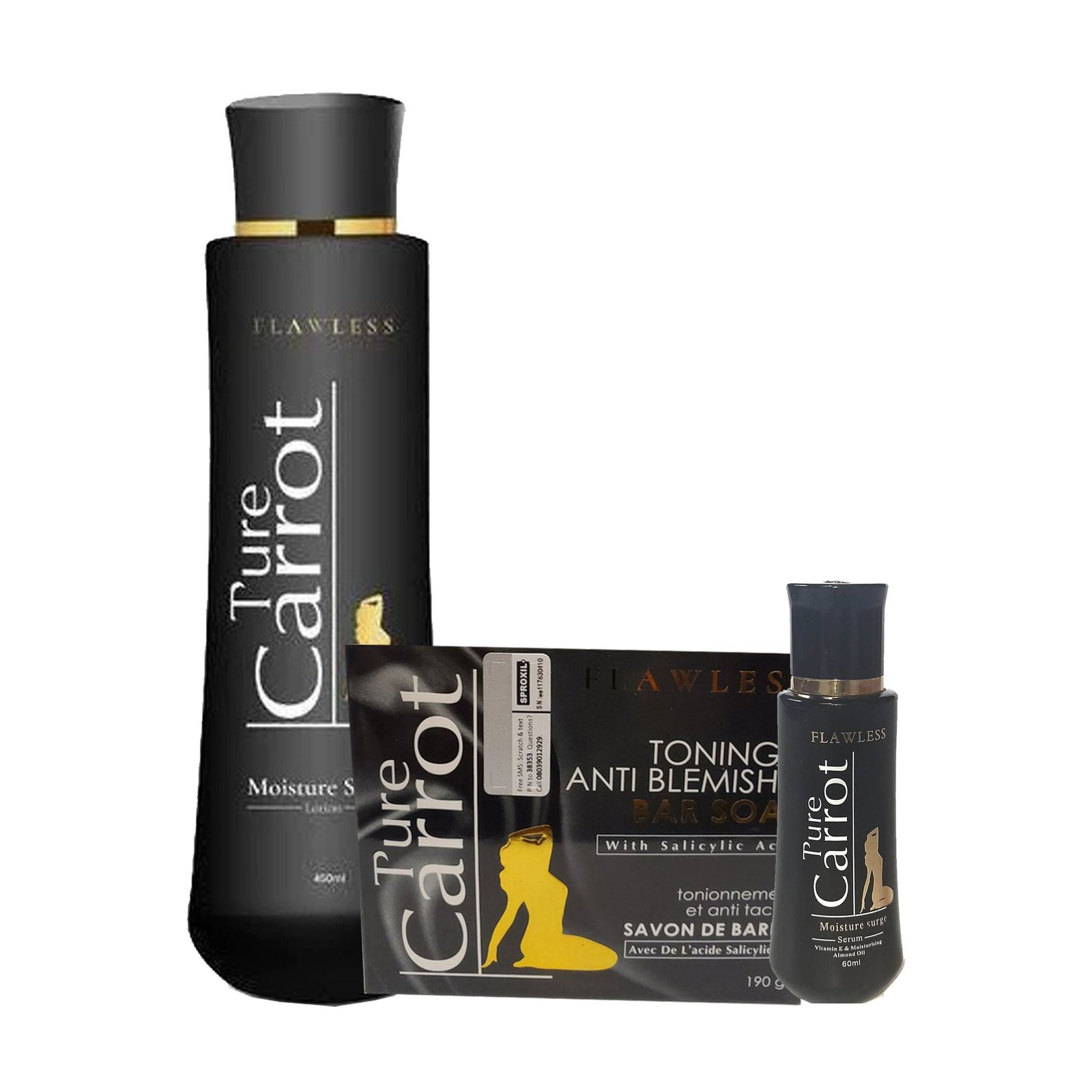 The Pure Carrot Flawless 3pc Set is a comprehensive beauty system designed for individuals seeking significant results and a flawless, golden-white complexion. This set includes the 450ml Lightening Body Lotion, the high-potency Serum booster, and the clarifying Carrot Soap. Formulated with high-grade Carrot Oil and active whitening agents, it targets hyperpigmentation and dullness across the whole body.