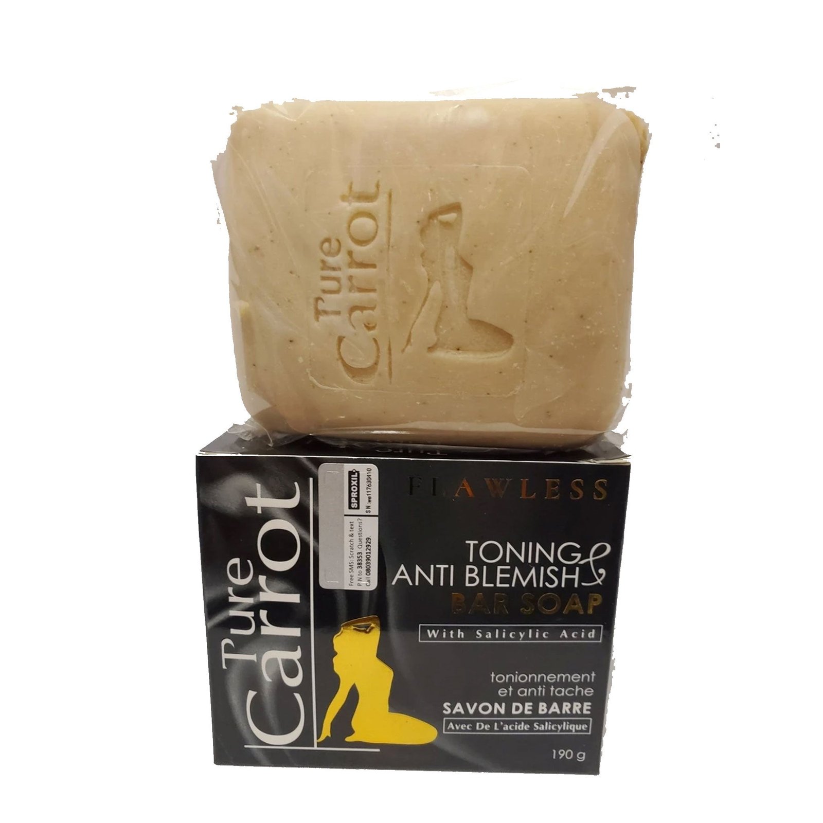 The PURE CARROT FLAWLESS TONING ANTI BLEMISH BAR SOAP is a clarifying and whitening cleansing bar that forms the essential foundation of a successful skincare regimen. This soap is uniquely formulated with Carrot Oil and mechanical exfoliating particles that gently scrub away dead skin cells, dirt, and impurities. The “Anti Blemish” formula is specifically designed to kill bacteria and remove excess sebum that can lead to acne and blackheads.