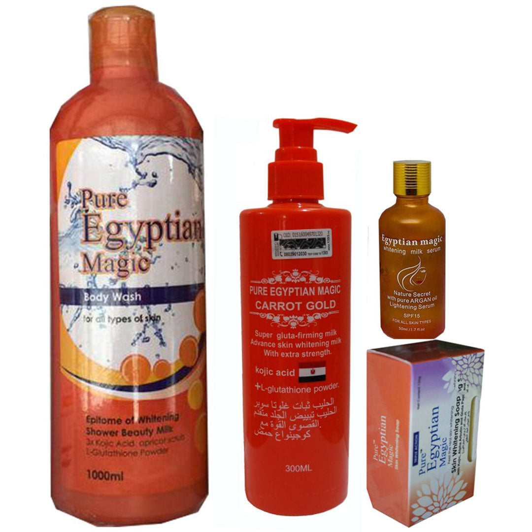 The Pure Egyptian Carrot 4-pc Bundle is the most comprehensive collection in the Pure Egyptian range, designed for a total head-to-toe skin transformation. This all-inclusive bundle typically includes the Carrot Body Milk, high-potency Serum, Whitening Body Wash, and the targeted Face Cream. Formulated with high-strength botanical whitening agents and natural Carrot Oil, it targets the toughest hyperpigmentation issues from head to toe.