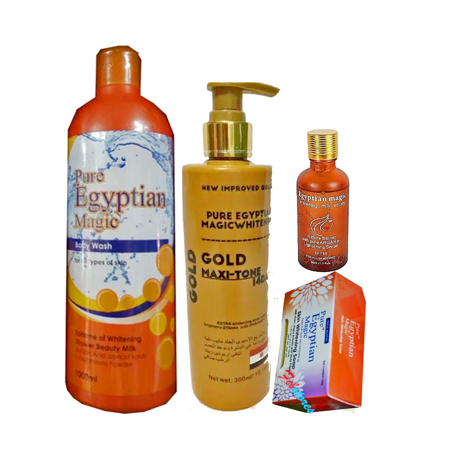 + Delivery in 24 Hours!Pure Egyptian Gold Maxitone ( Lotion, Serum, Bath And Soap ) Pack of 3 is the complete 4-piece whitening set with Gold particles that inhibits melanin and repairs skin for a shimmering, fair, and radiant body tone.