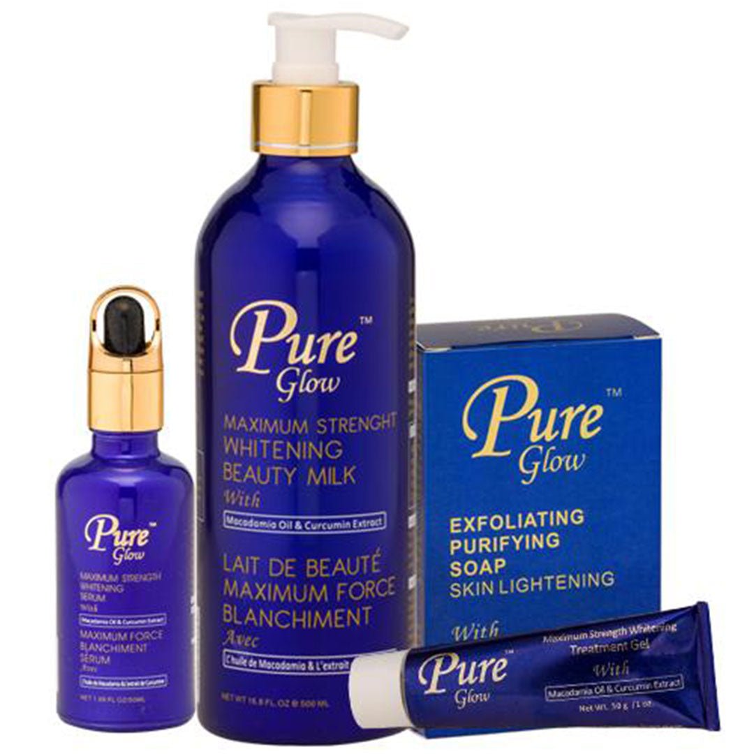 The Pure Glow Pack of 3 is a gentle yet effective whitening regimen designed to provide a “pure” and healthy-looking complexion. This set includes the Lightening Beauty Milk, Lightening Serum, Treatment Tube Cream, and Exfoliating Soap. It is formulated with Macadamia Oil and Vegeclairine. Macadamia oil is incredibly rich in nourishing fatty acids that mimic the skin’s natural oils, making it an excellent hydrator for sensitive and dry skin types.