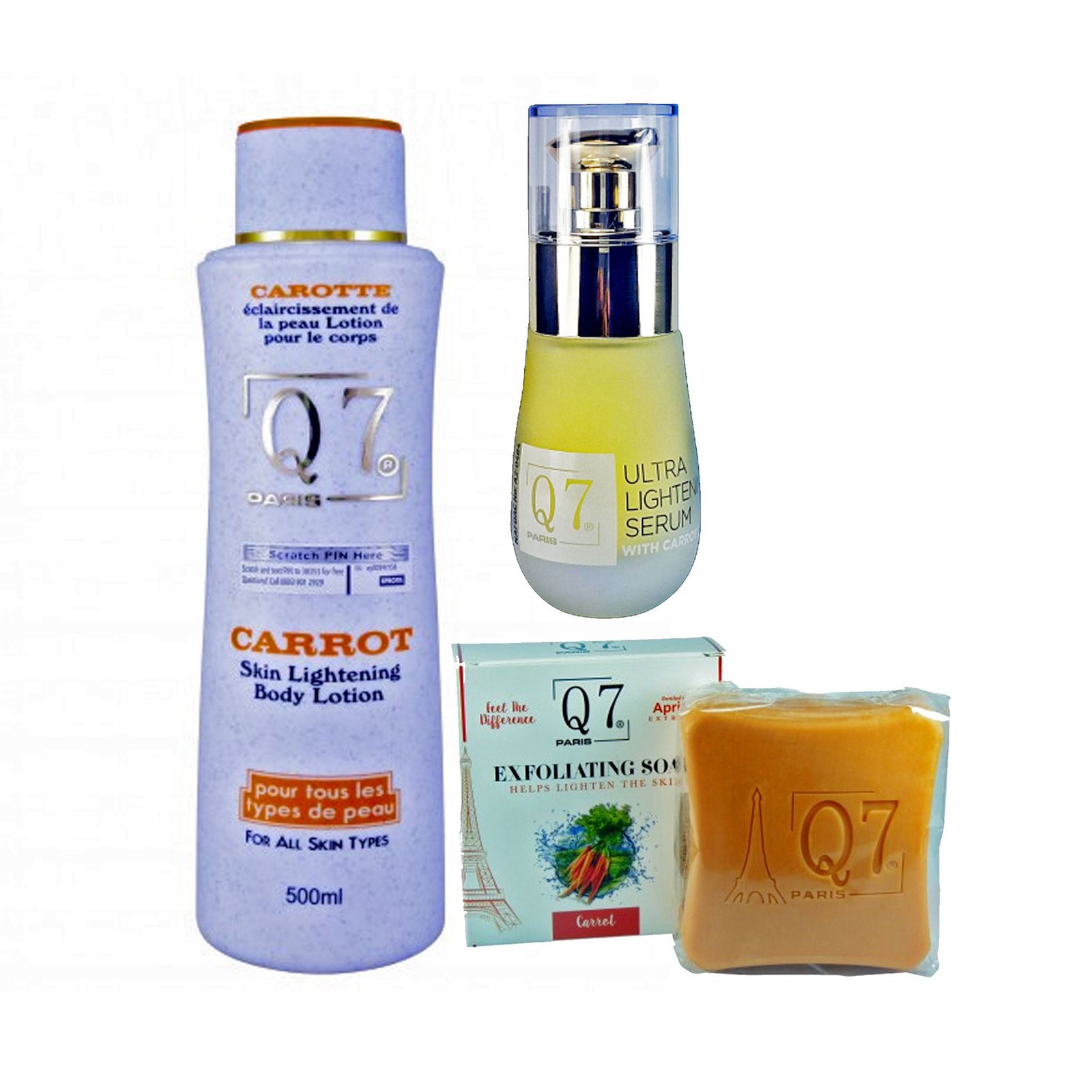 + Delivery in 24 Hours!Q7 Paris Carrot ( Lotion, Serum And Soap ) Pack of 3 is the 3-piece whitening set with Carrot Extract that inhibits melanin and repairs skin for a fair, radiant, and unified body tone.