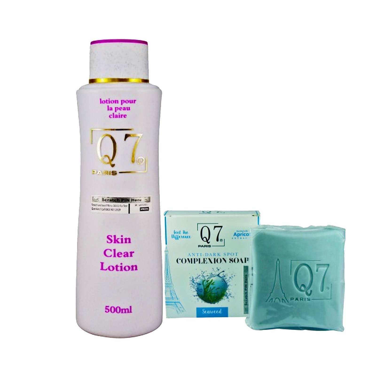 + Delivery in 24 Hours!Q7 Paris Skin Clear Lotion And Soap Pack of 3 is the 2-piece whitening set with Lotion and Soap that inhibits melanin and repairs skin for a fair, radiant, and unified body tone.