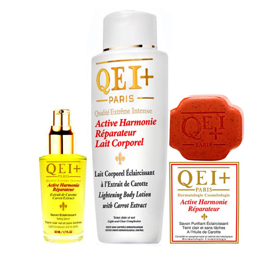 The Qei+ Active Harmonie Reparateur Pack of 3 is a comprehensive skin-brightening system designed for individuals seeking to repair damaged skin while achieving a significantly fairer tone. This premium kit includes the 500ml Body Lotion, the high-potency Serum, and the clarifying Exfoliating Soap. Formulated with a multivitamin complex and natural Carrot Oil, it targets hyperpigmentation and dullness across the entire body.